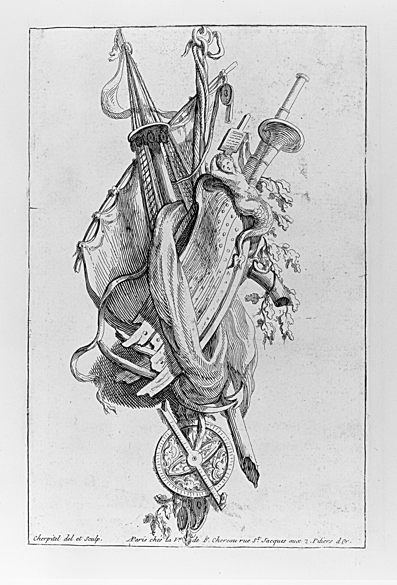 Print, Design for a Trophy; Designed by Mathurin Cherpitel (French, 1736 – 1809); Published by Geneviève-Marguerite Chéreau (French, active 1755-1768); France; etching on laid paper; Purchased for the Museum by the Advisory Council; 1921-6-269-2