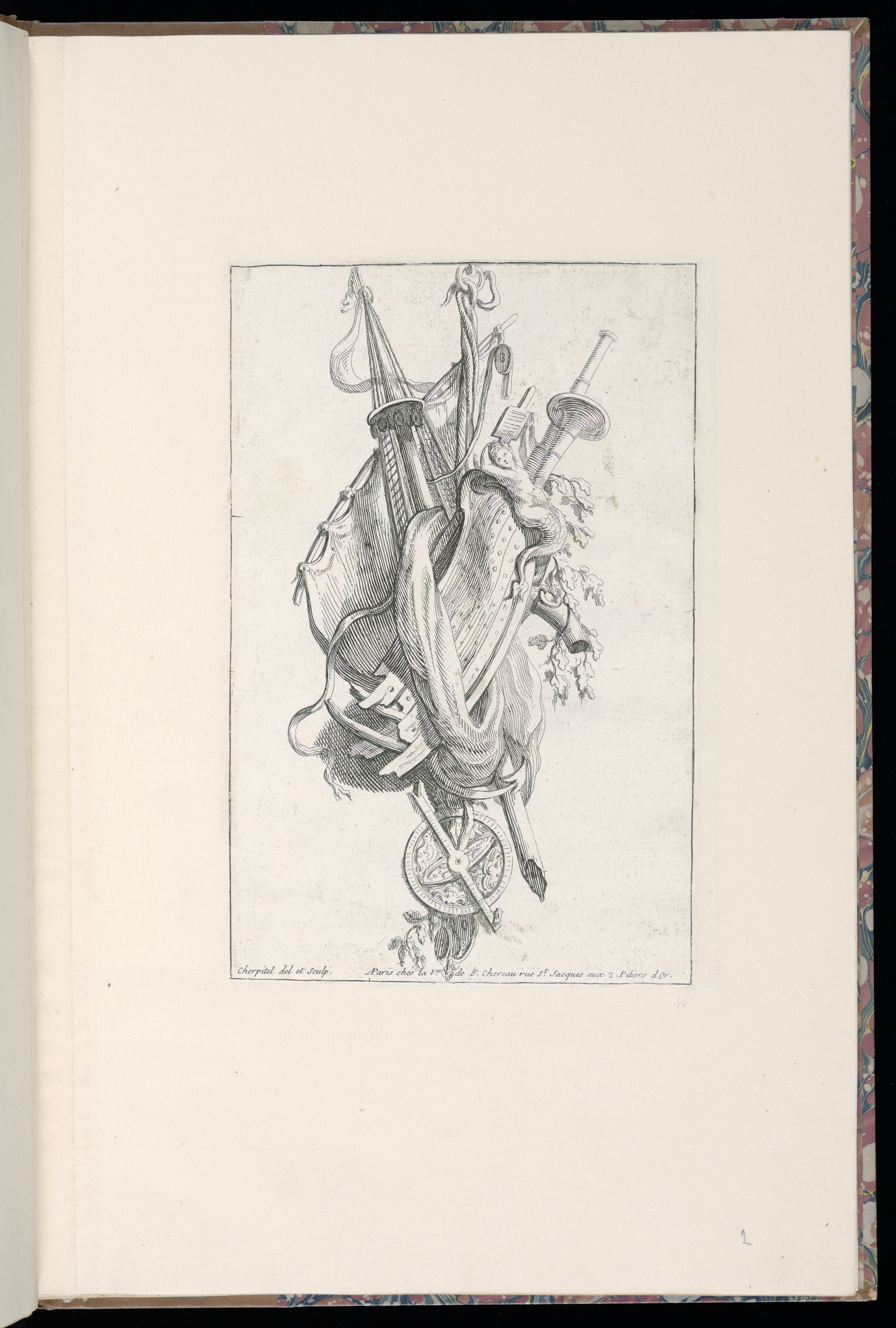 Print, Design for a Trophy; Designed by Mathurin Cherpitel (French, 1736 – 1809); Published by Geneviève-Marguerite Chéreau (French, active 1755-1768); France; etching on laid paper; Purchased for the Museum by the Advisory Council; 1921-6-269-2