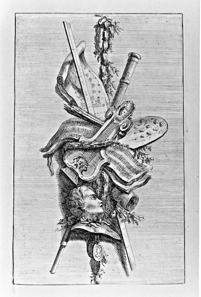 Print, Design for a Trophy; Designed by Mathurin Cherpitel (French, 1736 – 1809); Published by Geneviève-Marguerite Chéreau (French, active 1755-1768); France; etching on laid paper; Purchased for the Museum by the Advisory Council; 1921-6-269-6