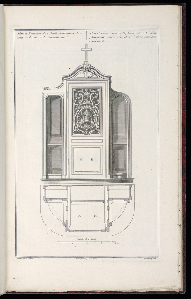 Lettered in plate, upper left: Plan et Elévation d’un Confessional ceintré d’une/ ance de Panier, et la Corniche en S.; lettered upper right : Plan et Elévation d’un Confessional ceintré d’un/ plein ceintre par le côté, et orné d’une Corniche/ aussi en S. ; numbered upper right : 4; lettered lower center : Echelle de 4. Pieds; inscribed in graphite, below plate, lower left : 12