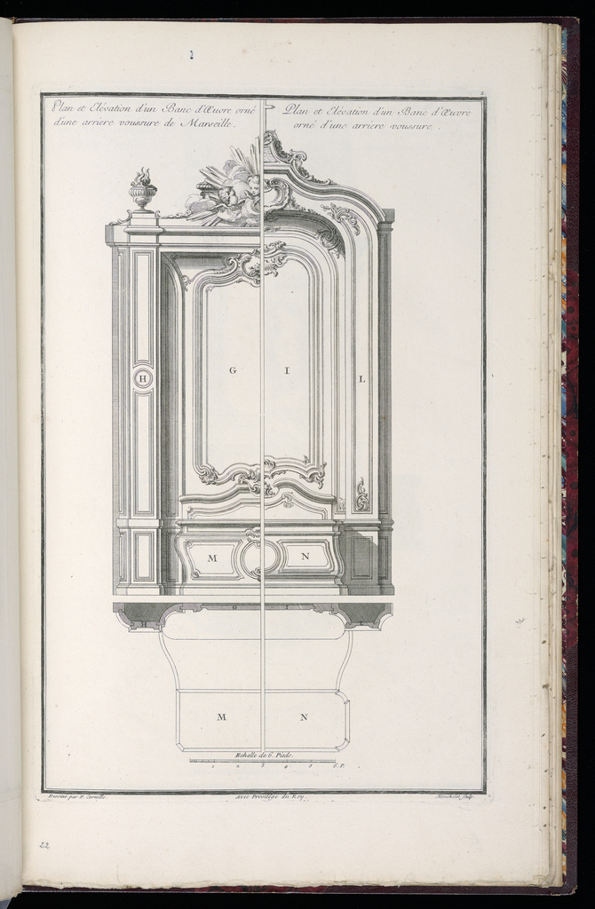 Lettered in plate, upper left: Plan et Elévation d’un Banc d’œuvre orné/ d’une arriere voussures de Marseille.; lettered upper right: Plan et Elévation d’un Banc d’œuvre/ orné d’une arriere voussure; numbered upper right : 2; lettered lower center : Echelle de 6. Pieds; inscribed in graphite below plate, lower left : 22