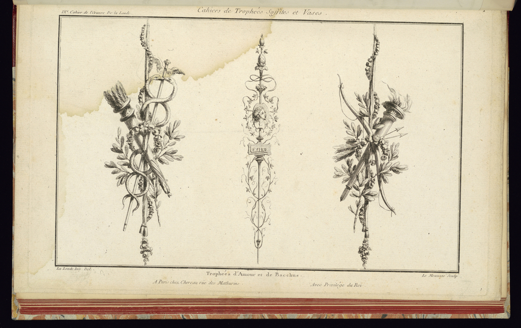 Printed upper left, in plate: IXe. Cahier de l'Oeuvre De la Londe; Printed upper center, in plate: Cahiers de Trophées Soffites et Vases.; Printed upper right, in plate [partially cut off]: I; Printed lower right, in plate: 1; Printed lower center, in plate: Trophées d'Amour et de Bacchus / A Paris chez Chereau rüe des Mathurins. Avec Privilége du Roi.