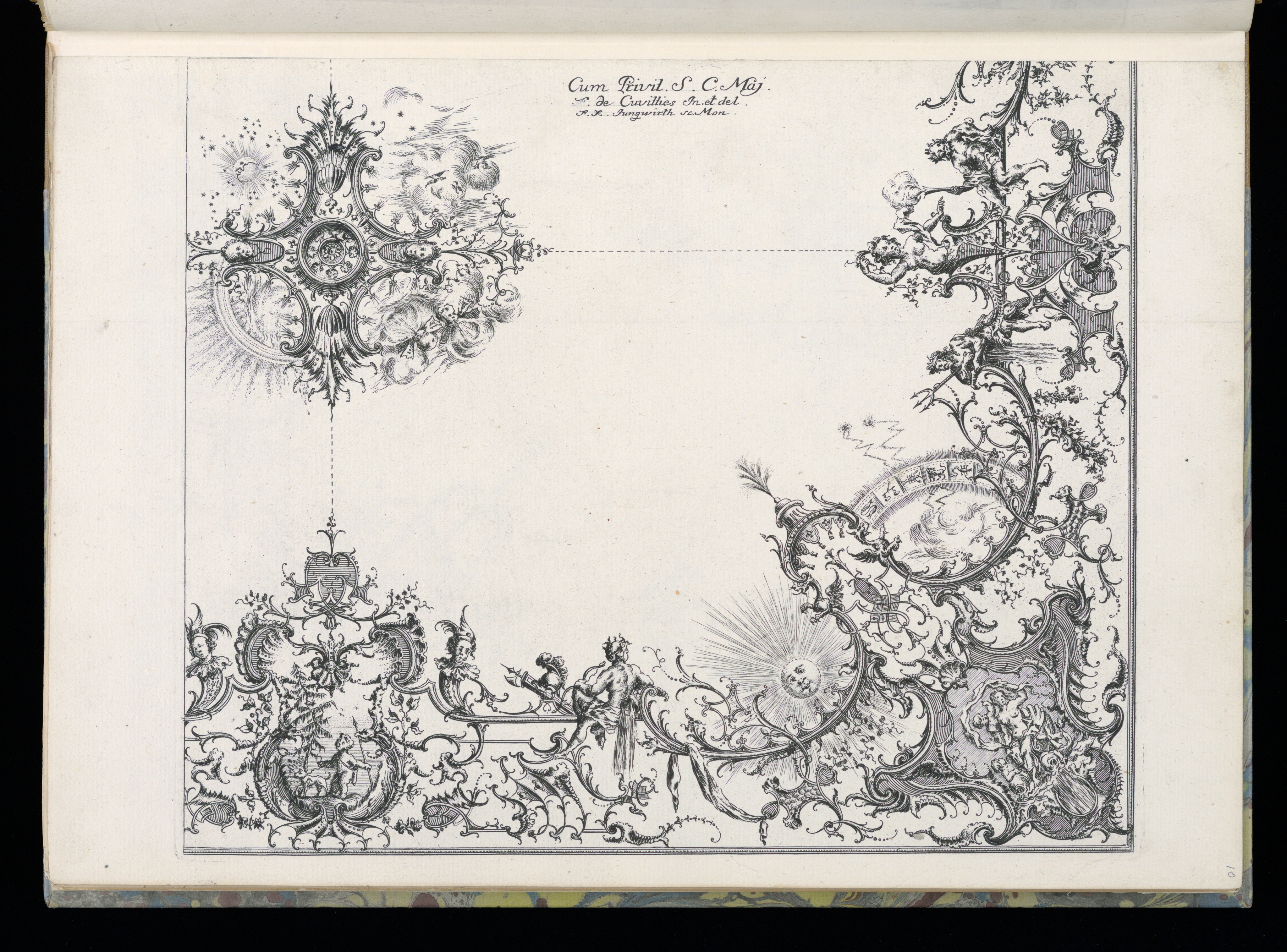 This is a Bound print. It was designed by François de Cuvilliés the Elder and print maker: Franz Xaver Andreas Jungwierth and published by François de Cuvilliés the Elder. It is dated 1740 and we acquired it in 1920. Its medium is engraving on white laid paper. It is a part of the Drawings, Prints, and Graphic Design department.