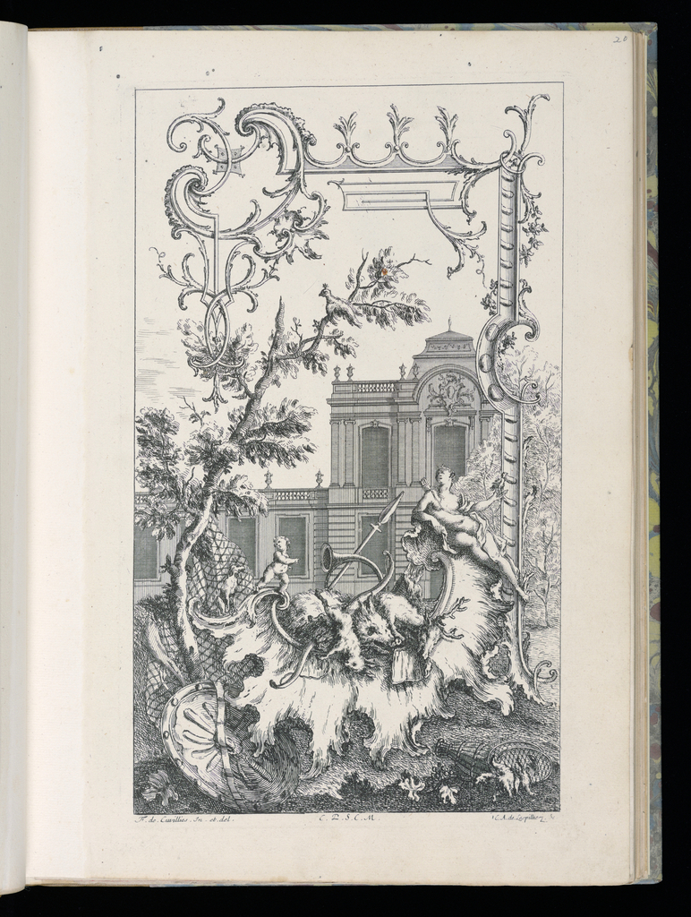 Bound Print, Cartouche with Hunting Motifs; Designed by François de Cuvilliés the Elder (Belgian, active Germany, 1695 - 1768); Print Maker: Carl Albert von Lespilliez (German, 1723 - 1796); Germany; engraving on cream laid paper; 39.2 x 25.1 cm (15 7/16 x 9 7/8 in.) Platemark: 35 x 21 cm (13 3/4 x 8 1/4 in.); Purchased for the Museum by the Advisory Council; 1921-6-282-21