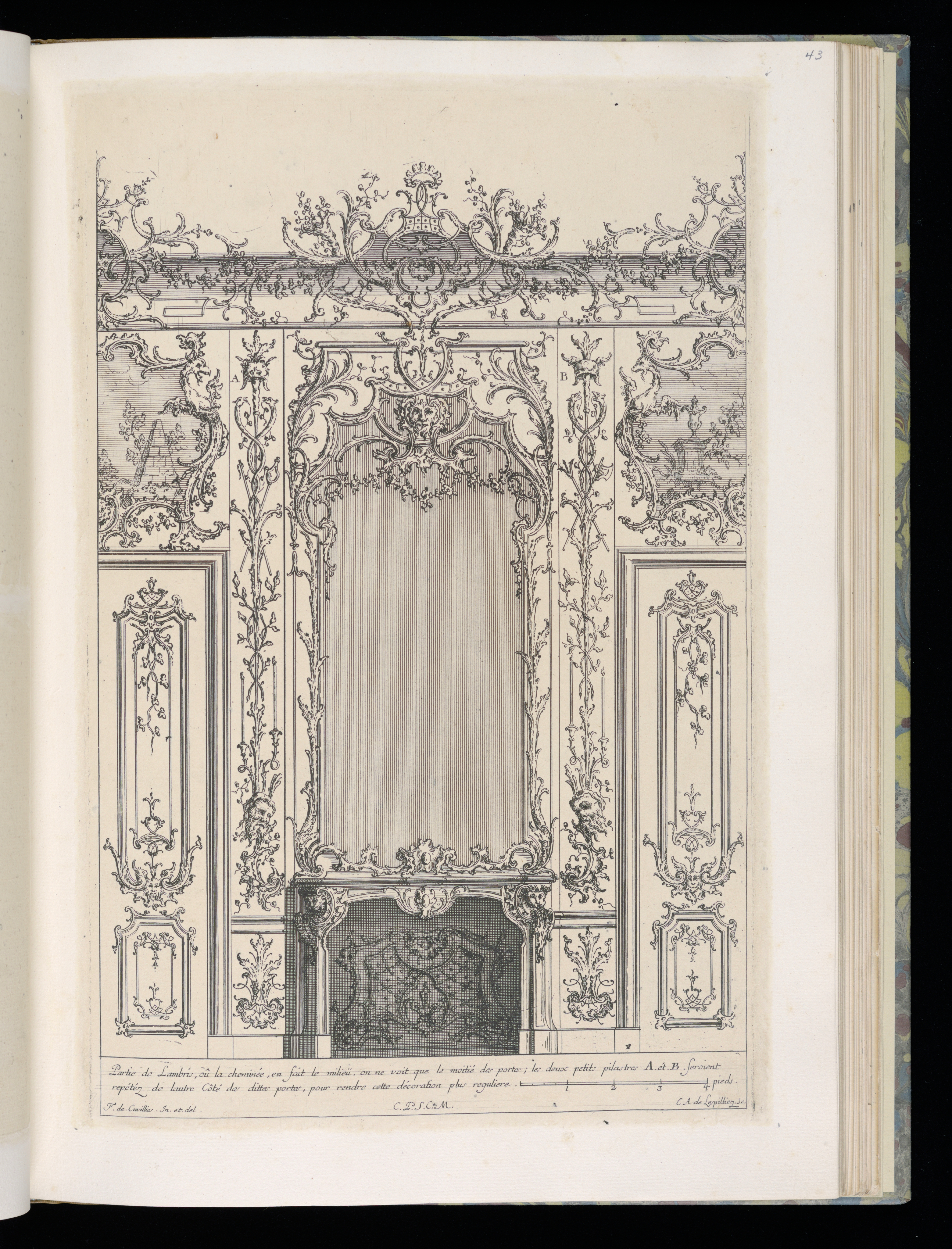 Printed in plate, lower center: Partie de Lambris, oû la cheminée, en fait le milieü. on ne voit que le moitié des portes; les deux petits pilastres A. ét. B. seroient / repétéz de lautre Côté des dittes portes, pour rendre cette décoration plus reguliere. / C. P. S. C. M.; inscribed in graphite, upper right, in margin: 43