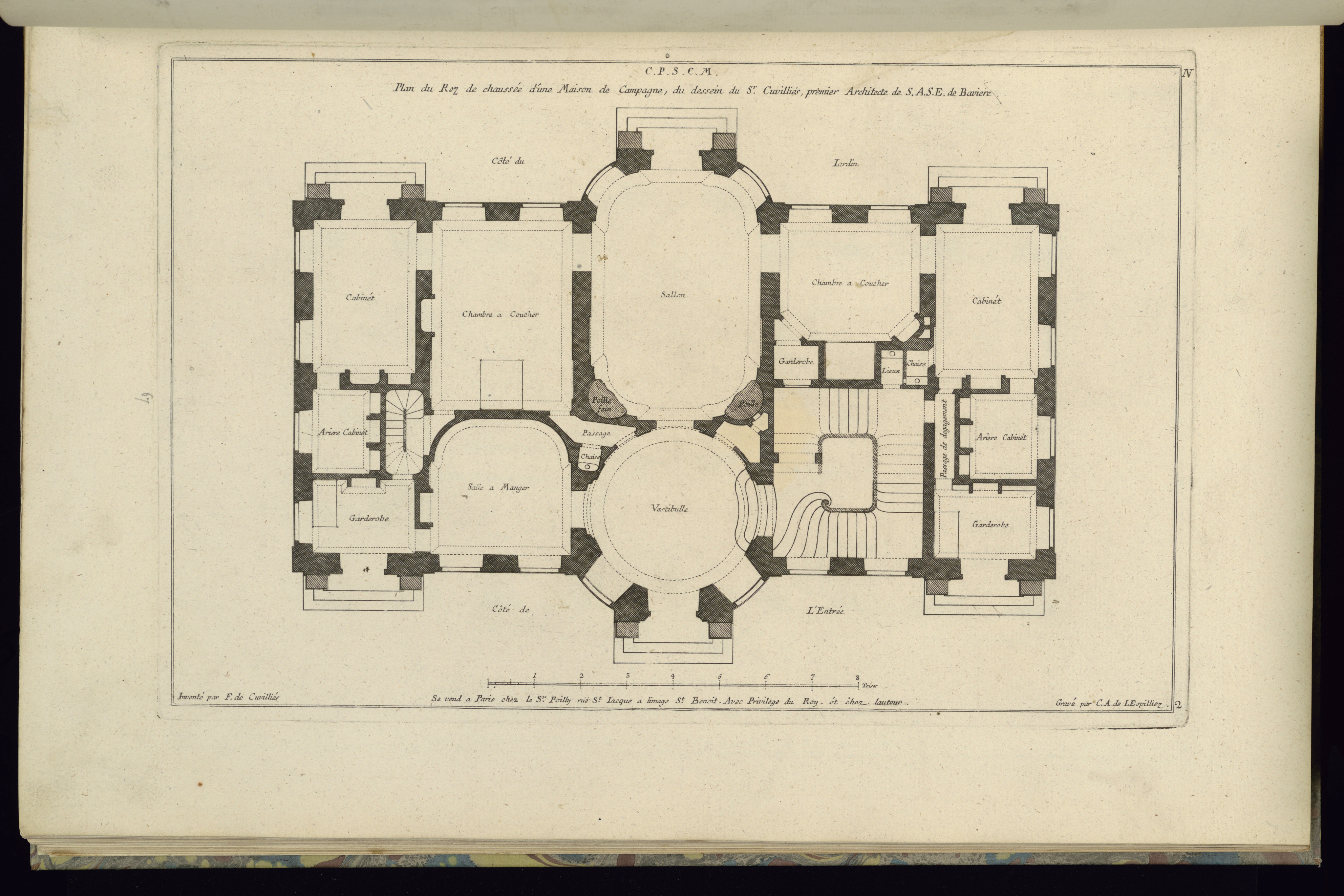 Printed upper center, in plate: Plan du Rez de chaussée d'une Maison de Campagne, du dessein du Sr. Cuvilliés, premier Architecte de S.A.S.E. de Baviere.; Printed upper right, in plate: N; Printed lower center, in plate: Se vend a Paris chez le Sr. Poilly ruë St. Iacque a limage St. Benoit Avec Privilege du Roy ét chez l'auteur.; Printed lower right, in plate: 2