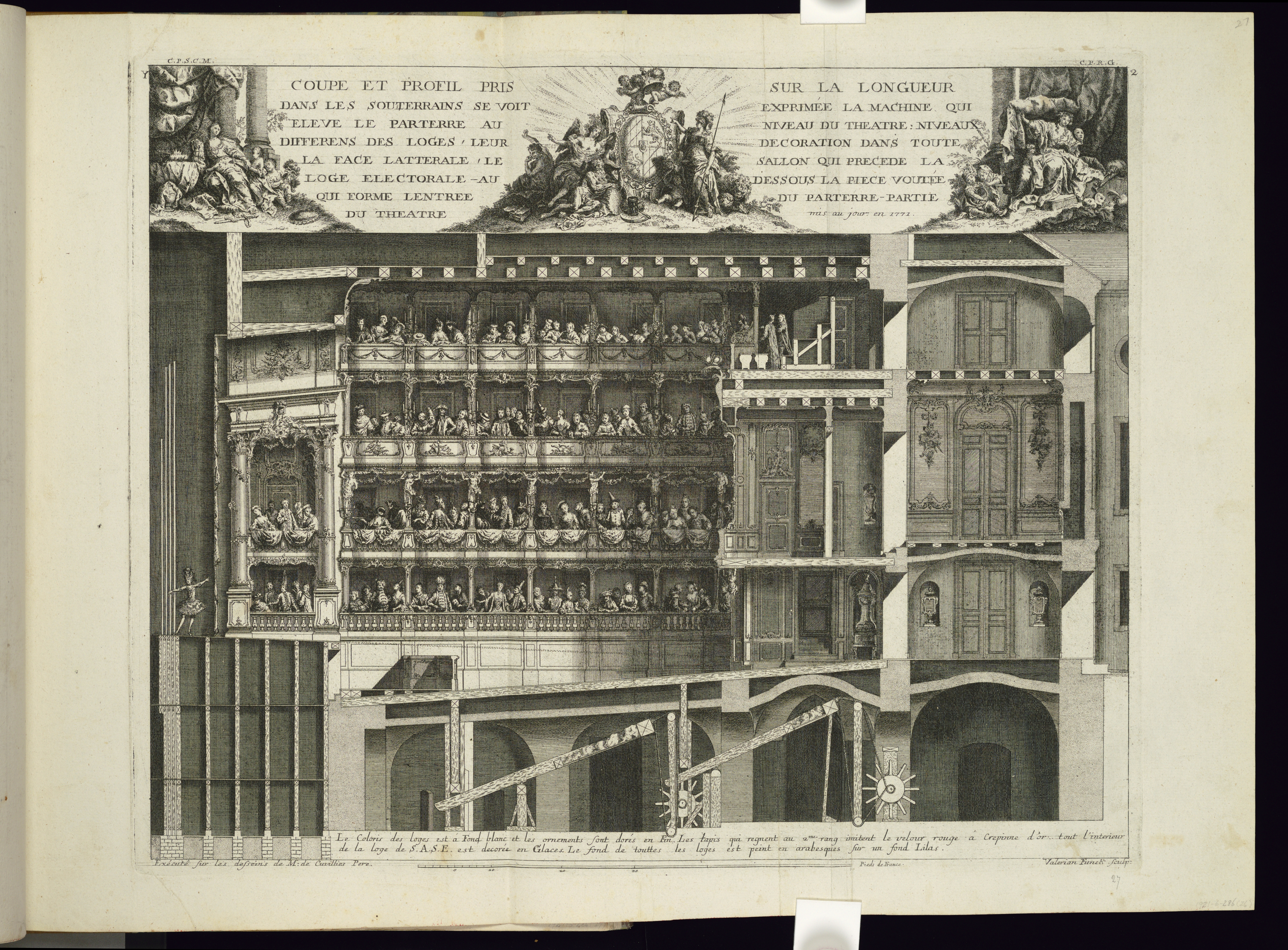 <ref name=CH>{{cite web |url=https://www-4.collection.cooperhewitt.org/objects/18242565/ |title=Print, Coupe et profile pris sur la longueur dans les souterrains se voit exprimée la machine qui eleve le parterre au niveau du theatre: Niveaux differens des loges leur decorations dans toute la face latterale le sallon qui precede la loge electorale au dessous la pieces voutée qui forme lentree du parterre partie du theatre. mis au jour en 1771 |author=Cooper Hewitt, Smithsonian Design Museum |accessdate=19 December 2025 |publisher=Smithsonian Institution}}</ref>