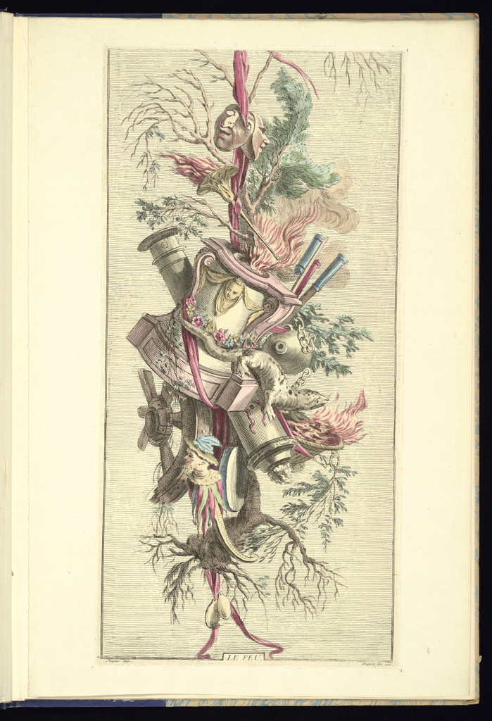 Print, Le Feu; Designed by Maurice Jacques; Published by Jacques-Gabriel Huquier (French, 1730 - 1805); Retailed by Louis-Joseph Mondhare (French, 1734–1799); France; hand-colored etching and engraving on paper; Purchased for the Museum by the Advisory Council; 1921-6-299-4