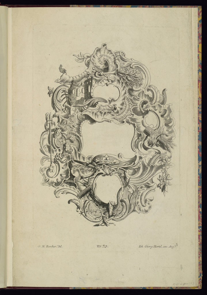 This is a Print. It was designed by Georg Michael Roscher and print maker: Johann Georg Hertel. It is dated mid- 18th century and we acquired it in 1920. Its medium is engraving on white laid paper. It is a part of the Drawings, Prints, and Graphic Design department.