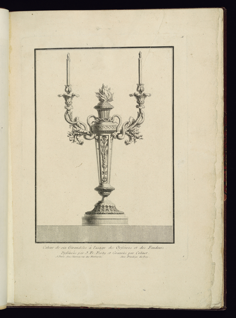 Lettered in plate, upper right: A; numbered lower right: 1; lettered lower center: Cahier de six Girandoles à l’usage des Orfévres et des Fondeurs/ Dessinées par J.Fr. Forty et Gravées par Colinet.
