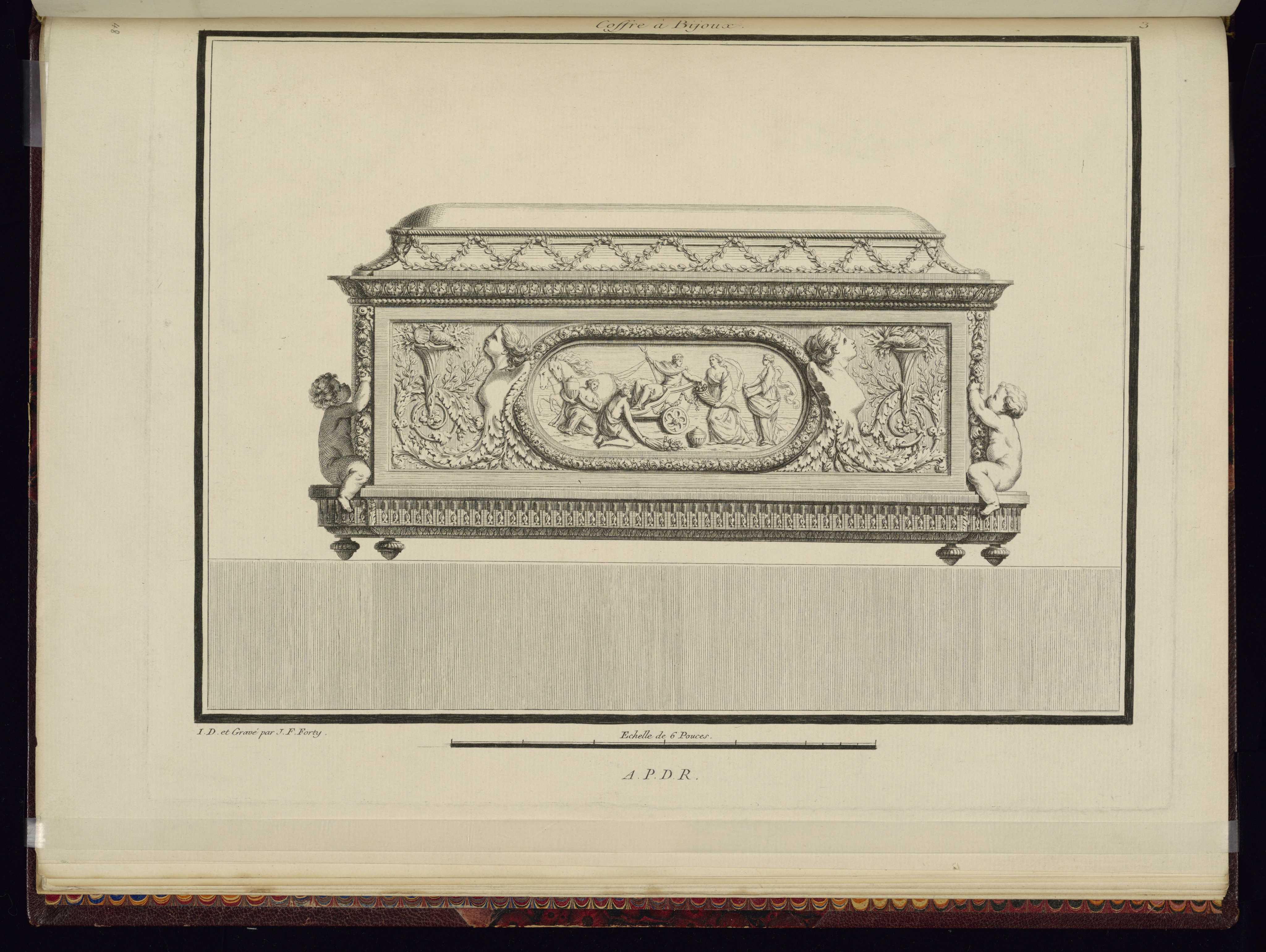 Print, Coffre à Bijoux; Designed by Jean François Forty (active 1775 – 1790); Published by Jacques-François Chéreau (French, 1742 - 1794); Dedicatee: Anne Louise Caroline de Goyon de Matignon (French, 1774 – 1846); France; etching and engraving on paper; Purchased for the Museum by the Advisory Council; 1921-6-310-50