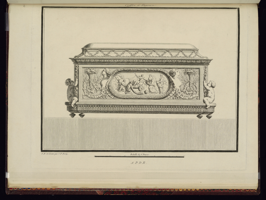 Lettered in plate, upper center: Coffre à Bijoux; numbered upper right: 3; lettered lower center: Echelle de 6 Pouces / A.P.D.R
