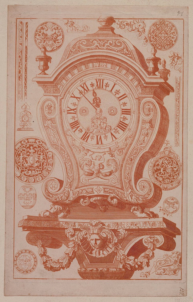 Print, Design for a Clock, plate 4, from Nouveaux livre de boites de pendulles de coqs et etuys de montres et autres necessaire au Orlogeurs; Designed by Daniel Marot (French, active in the Netherlands and England, 1661–1752); France; etching printed in red ink on paper; Mount: 34.2 x 22.1 cm (13 7/16 x 8 11/16 in.) Sheet:: 29.8 x 19.1 cm (11 3/4 x 7 1/2 in.) Platemark: 28.5 x 19.5 cm (11 1/4 x 7 11/16 in.) Mat: 45.7 x 35.6 cm (18 x 14 in.) Frame H x W x D: 50.2 x 39.7 x 2.5 cm (19 3/4 in. x 15 5/8 in. x 1 in.); Purchased for the Museum by the Advisory Council; 1921-6-352-77