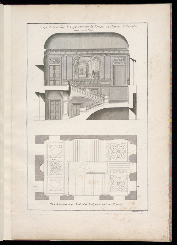 Lettered in plate, upper center: Coupe de l’Escalier de l’Appartement des Princes, au Château de Versailles, / prise sur la ligne C.D; lettered lower center: Plan du premier étage de l’Escalier de l’Appartement des Princes; inscribed in graphite lower right margin: 4