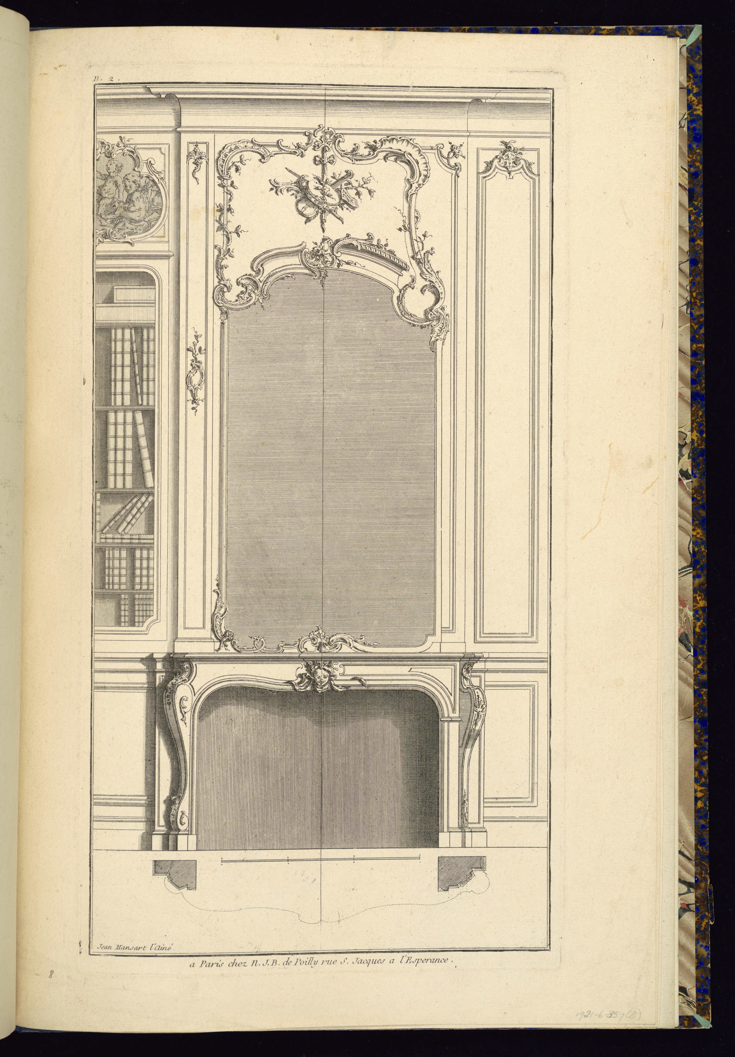 Print, Fireplace (Chimney Piece and Mantel) Designs; Designed by Jean Mansart de Jouy (French, 1705 - 1783); Published by Nicolas Jean Baptiste de Poilly (France, 1712 – ca. 1758); France; etching and engraving on laid paper; Purchased for the Museum by the Advisory Council; 1921-6-357-8