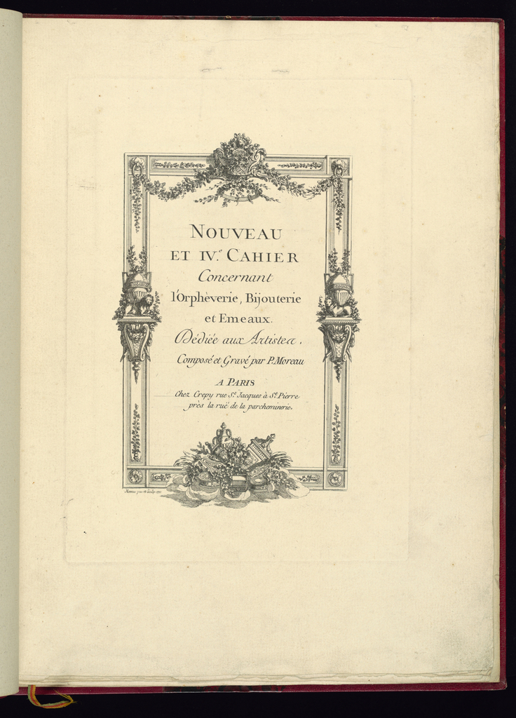Lettered in plate center within frame : NOUVEAU / ET IVe CAHIER / Concernant / l’Ophèverie, Bijouterie / et Emeaux./ Dédié aux Artistes./ Composé et Gravé par P. Moreau.