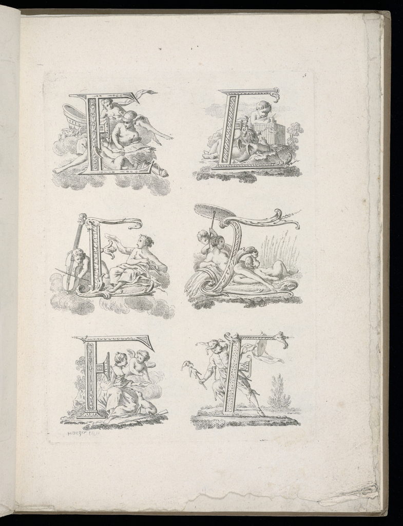 Print, Designs for the Letters E and F; Designed by Jean Baptiste Piauger (French, active 1760s); Written by Jean Henry Prosper Pouget; Published by Nicolas-Martin Tilliard (French, 1723? – 1773); France; etching and engraving on laid paper; Purchased for the Museum by the Advisory Council; 1921-6-375-5