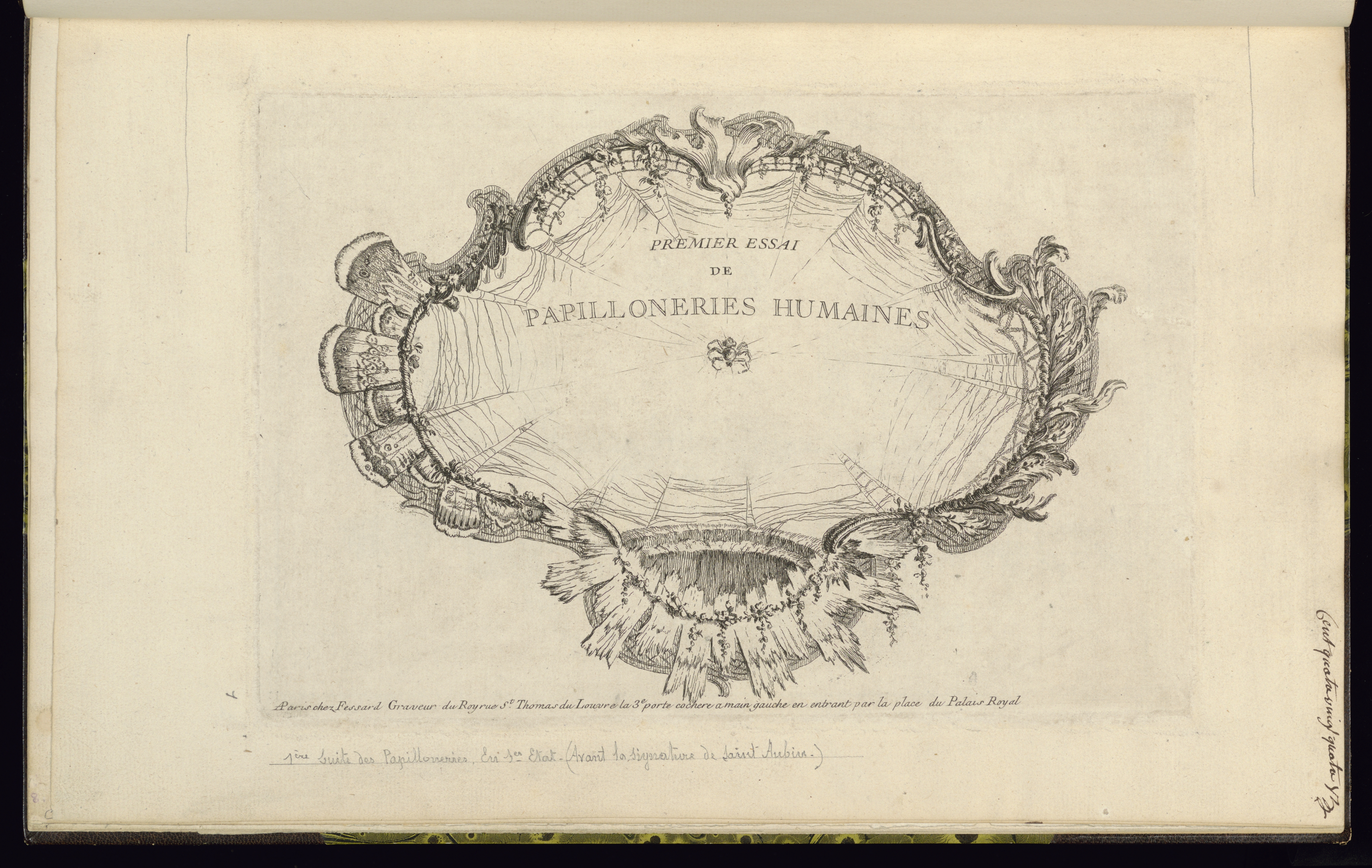 Printed center of plate: PREMIER ESSAI / DE / PAPILLONERIES HUMAINES; Printed lower center, in plate: AParis chez Fessard Graveur du Roy rue St. Thomas du Louvre la 3e porte cochere a main gauche en entrant par la place du Palais Royal; Inscribed in graphite, lower center, in margin: 1ère Suite des Papillonerries, En 1er Etat.(Avant la signature de Saint Aubin.); Inscribed in graphite, lower left, vertically in margin: 1; Inscribed in sepia ink, lower right, in margin: Cent quatre vingt quatorze