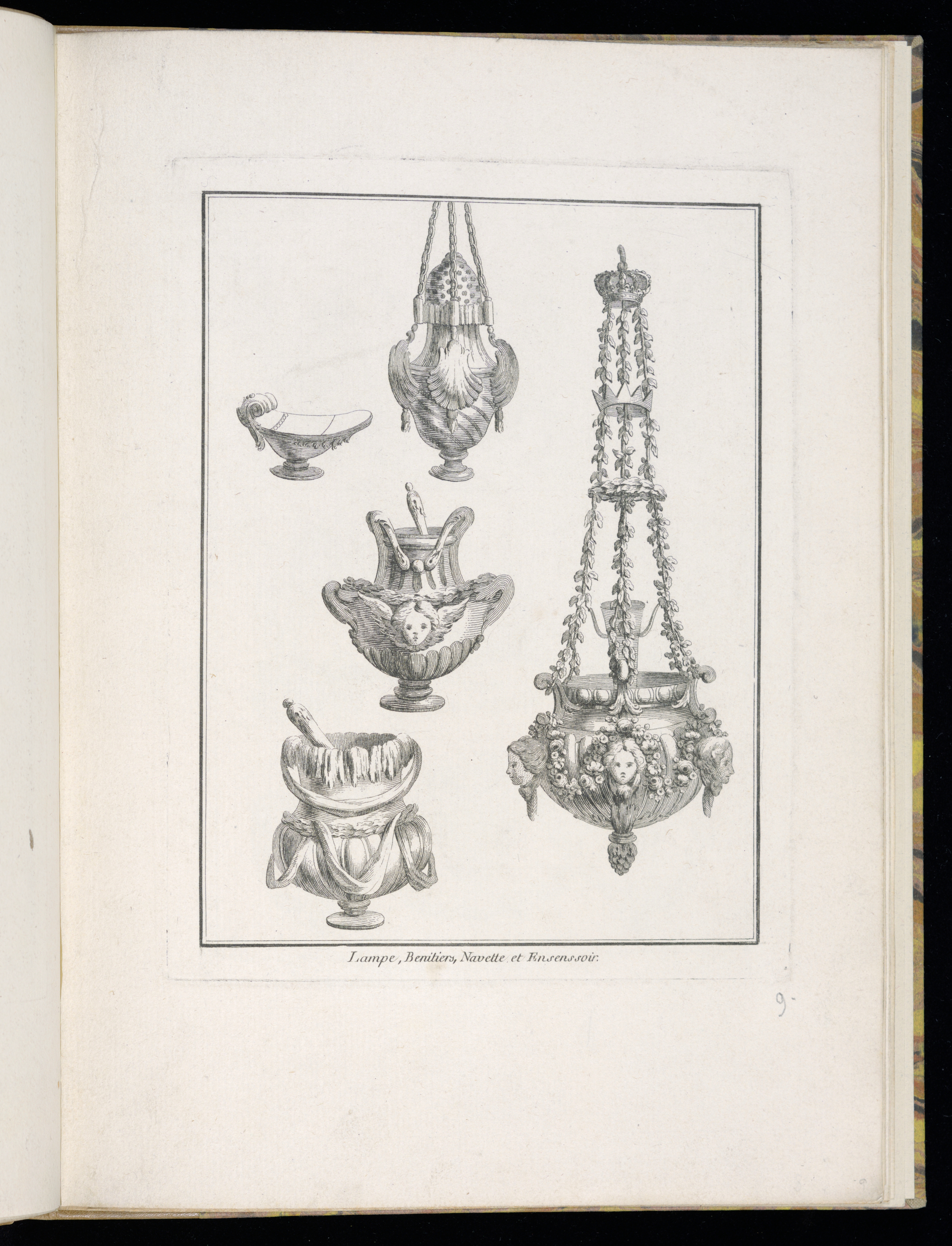 Inscribed in graphite, lower right margin: 9; inscribed in graphite below plate, lower right: 9; lettered in plate, lower center: Lampe, Benitiers, Navette et Ensenssoir