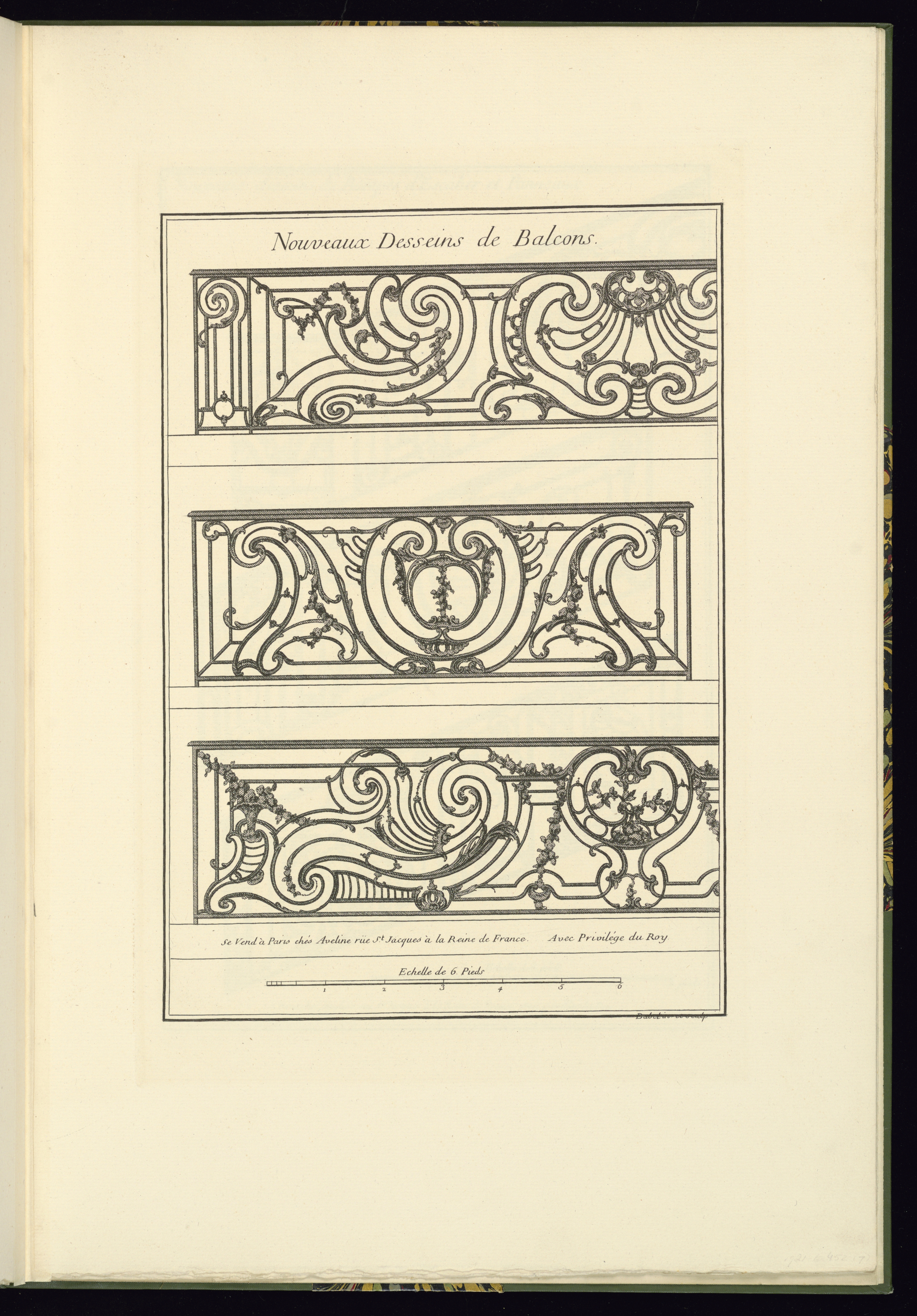 Lettered in plate, upper center: Nouveaux Desseins de Balcons; lettered lower center: Echelle de 6 Pieds.; inscribed in graphite lower right margin: 1921-6-452(7)