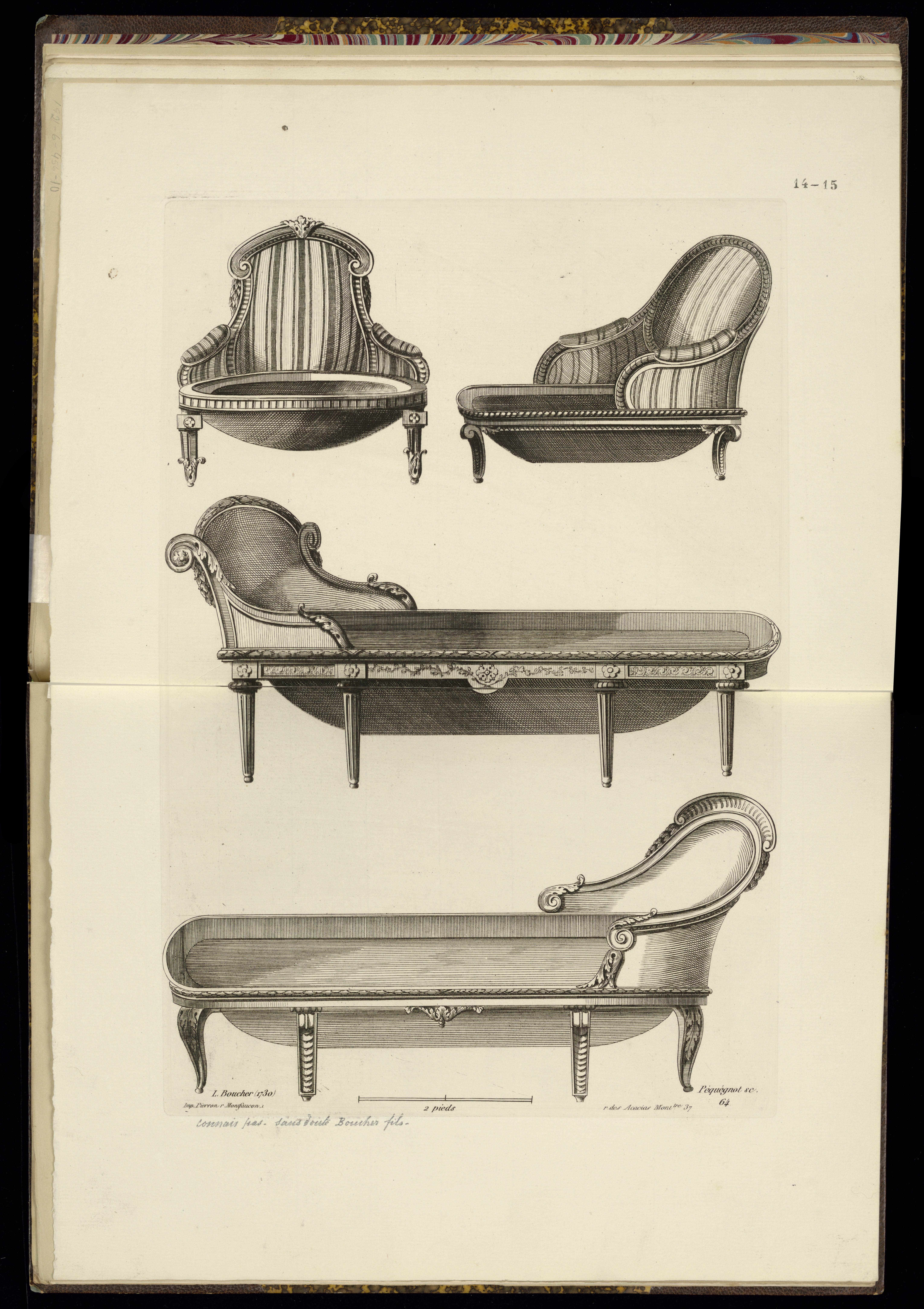 Numbered above plate, upper right: 14-15; numbered in plate, lower right: 64/ r. des Acacias Montre. 37; inscribed in graphite lower left, below plate: Connais pas. Sans doute Boucher fils.