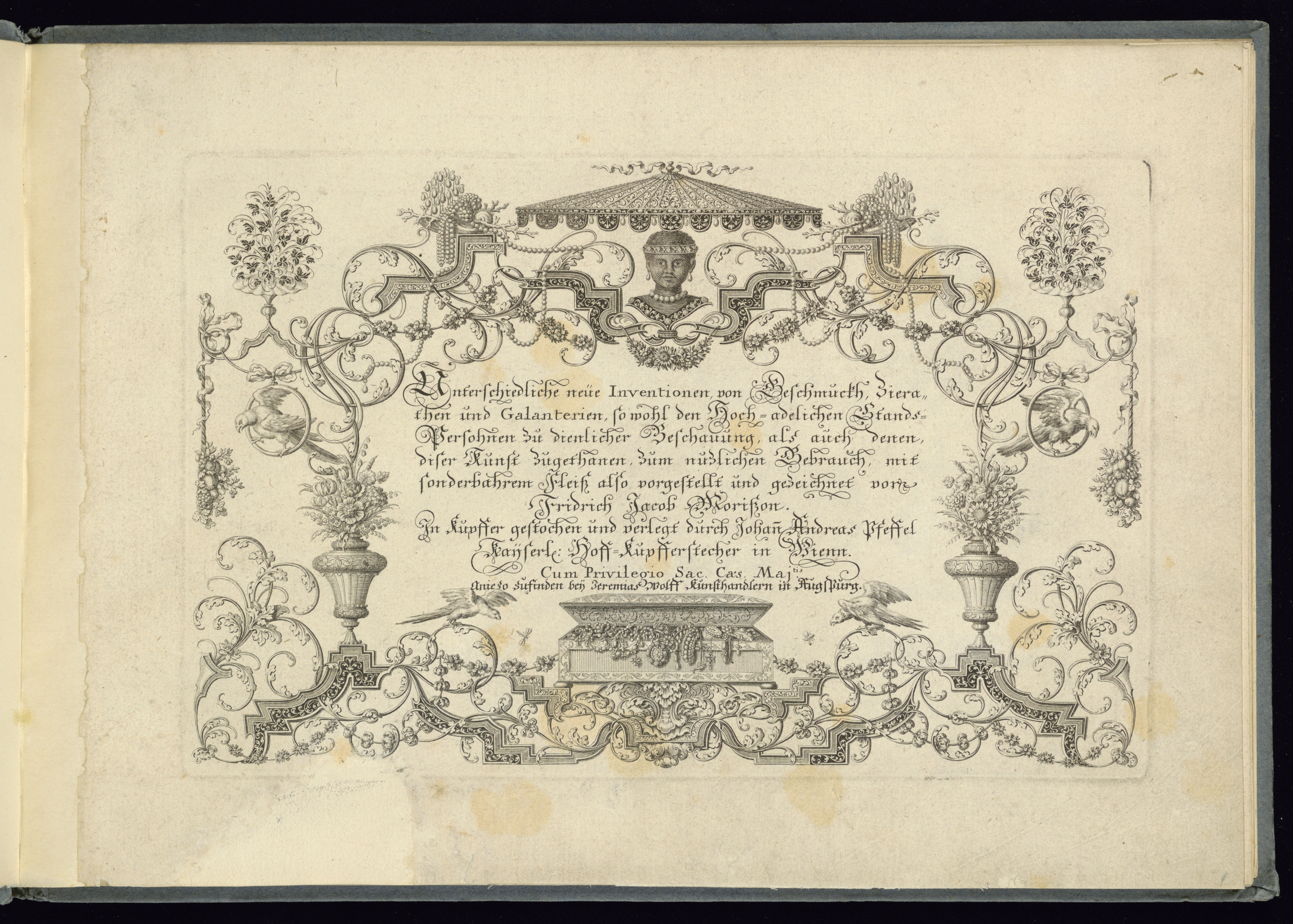 Inscribed in plate, center: Unterschiedliche neue Inventionen von Geschmuckh, Zierathen und Galanterien, so wohl den hoch-adelichen Stands-Versohnen zu dienlicher Beschauung, als auch denen diser Kunst zugethanen, zum nüzlichen Gebrauch, mit sonderbahrem Fleiss also vorgestellt und gezeichnet vom Fridrich Jacob Morisson. In Kupffer gestochen und verlegt durch Johan Andreas Pfeffel Kayserl. Hoff-Küpfferstecher in Wienn. Cum Privilegio Sac. Caes. Maj.tis