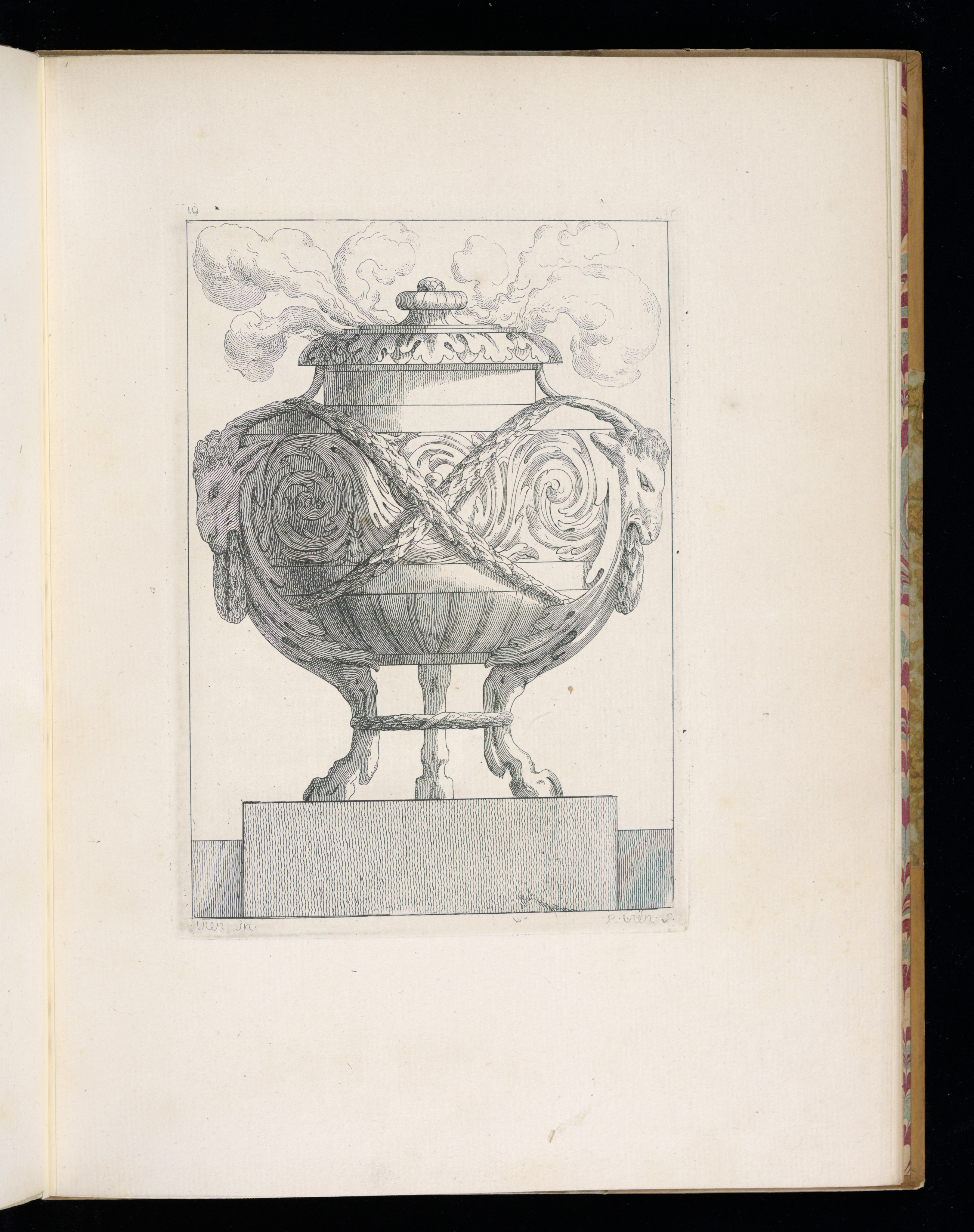 Print, Ornamental Vase Design; Designed by Joseph Marie Vien the Elder (French, 1716 – 1809); Engraved by Marie Thérèse Reboul (French, 1728 - 1805); France; etching on laid paper; Purchased for the Museum by the Advisory Council; 1921-6-477-10