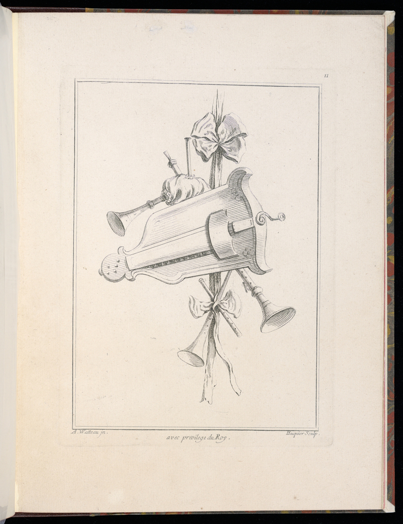 Lettered in plate, lower left: A. Watteau in.; lower center: avec privilege du Roy; lower right: Huquier Sculp.