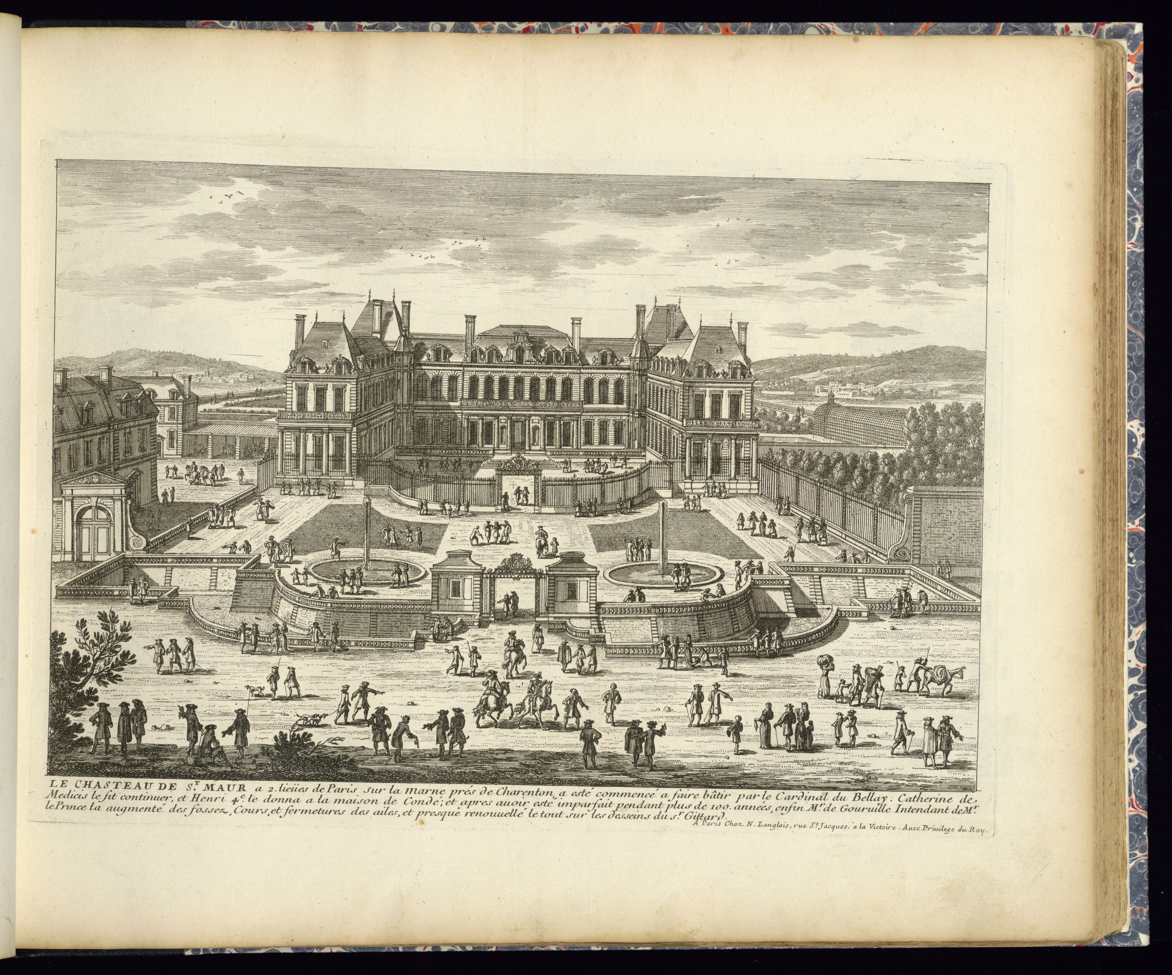 Lettered in plate, lower center: LE CHASTEAU DE ST. MAUR a 2 lieües de Paris sur la Marne prés de Charenton a esté commencé a faire bâtir par le Cardinal du Bellay. Catherine de/ Medicis le fit continuer, et Henri 4e le donna a la maison de Condé; et apres avoir esté imparfait pendant plus de 100 années, enfin Mr. de Gourville Intendant de Mr./ le Prince la augmenté des fossez, cours, et fermetures des ailes, et Presque renouvellé le tout sur les desseins du Sr. Gittard.