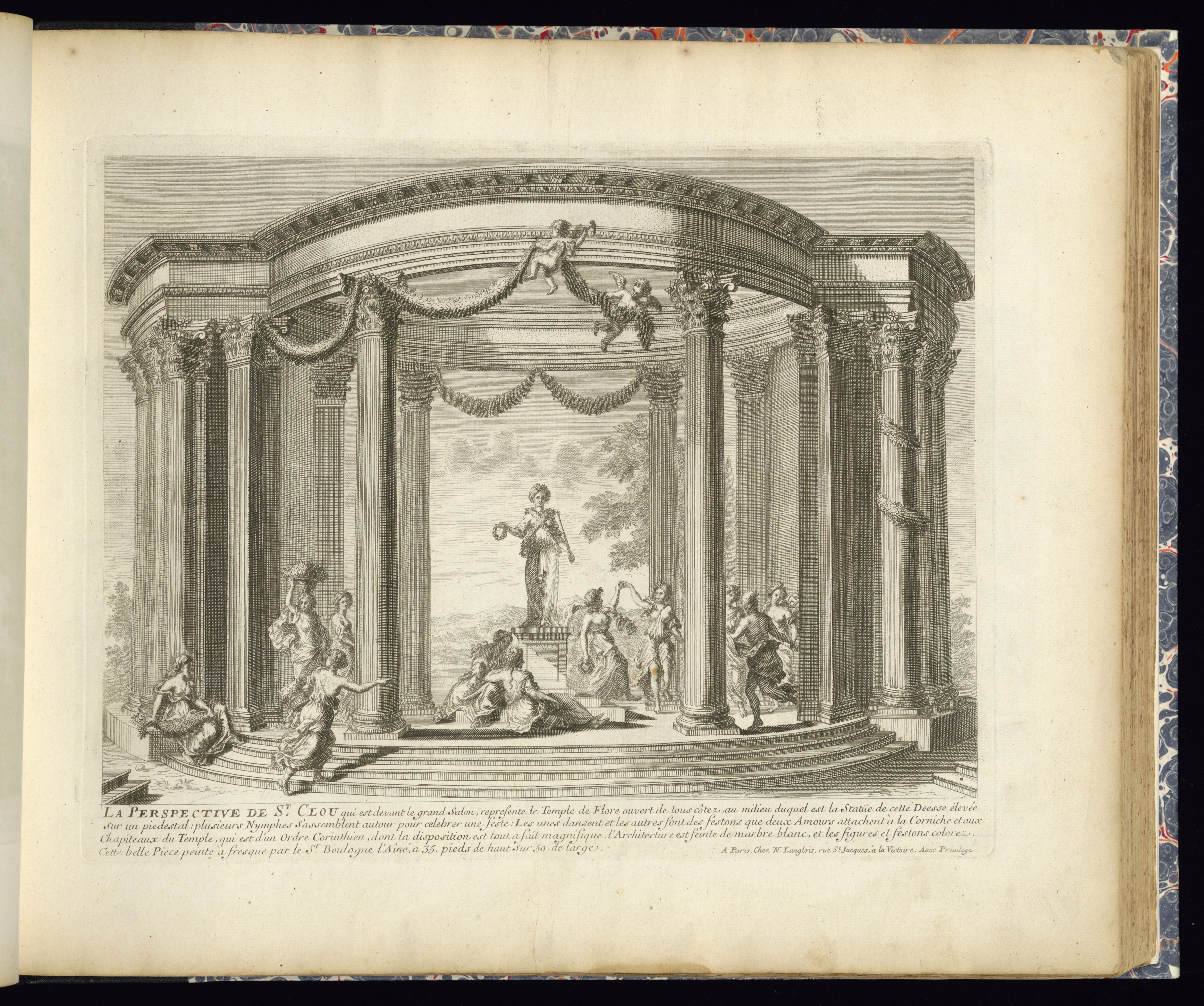 Lettered in plate, lower center: LA PERSPECTIVE DE ST. CLOU qui est devant le grand Salon represente le Temple de Flore ouvert de tous côtez, au milieu duquel est a la Statüe de cette Deesse élevée/ sur un piedestal: plusieurs Nymphes s’assemblent autour pour celebrer une feste: Les unes dansant et les autres sont des festons que deux Amours attachent à la Corniche et aux/ Chapiteaux du Temple, qui est d’un Ordre Corninthien, dont la disposition est tout a fait magnifique. L’Architecture est feinte de marbre blanc, et les figures et festons colorez./ Cette belle Piece peinte à fresque par le Sr Boulogne l’Ainé a 35 Pieds de haut sur 50 de large.