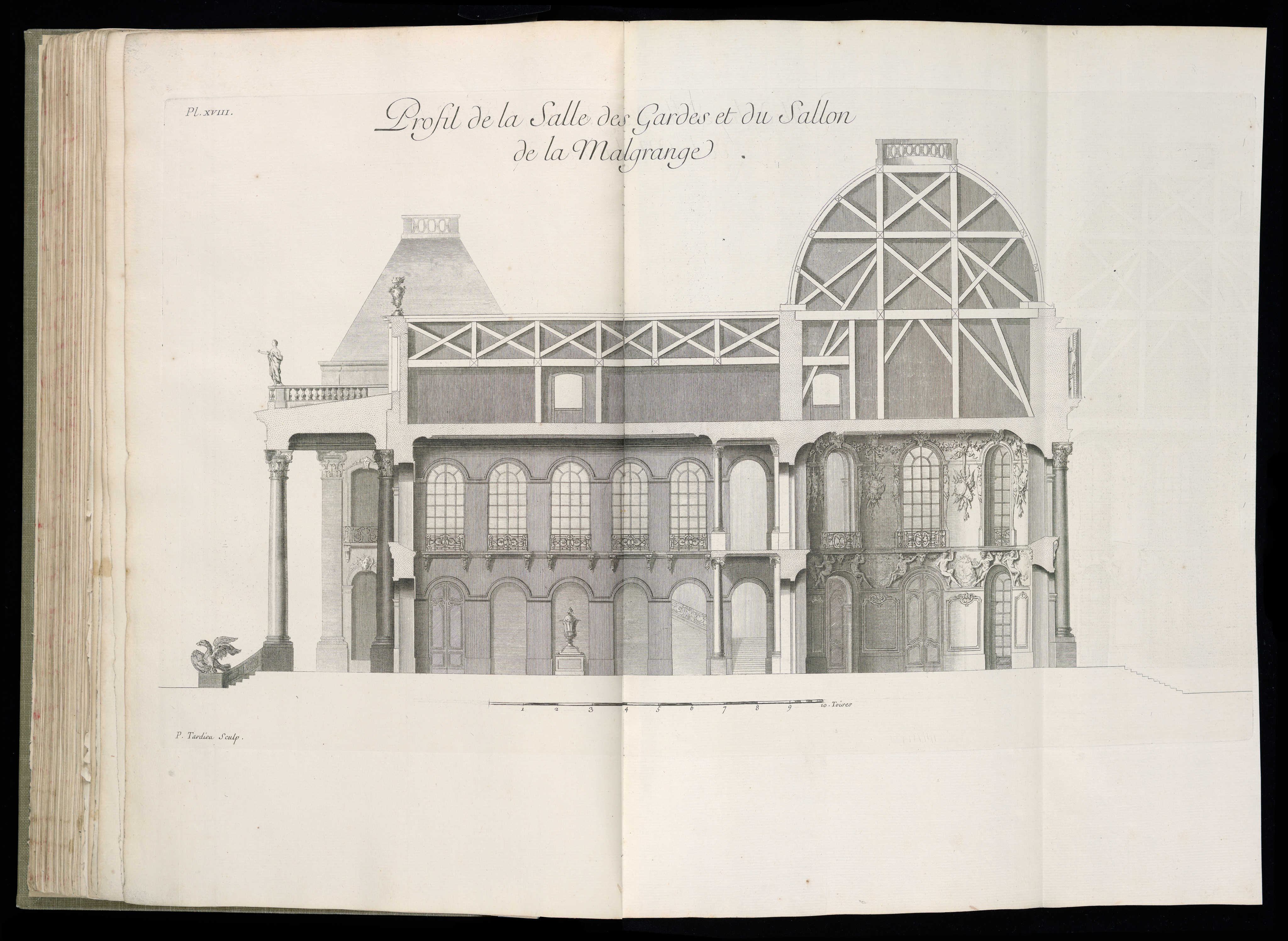 This is a Bound print. It was designed by Germain Boffrand and published by Guillaume Cavalier Père and engraved by Jacques-François Blondel and Pierre François Tardieu and collaborator: François Boucher. It is dated 1745 and we acquired it in 1920. It is a part of the Drawings, Prints, and Graphic Design department.
