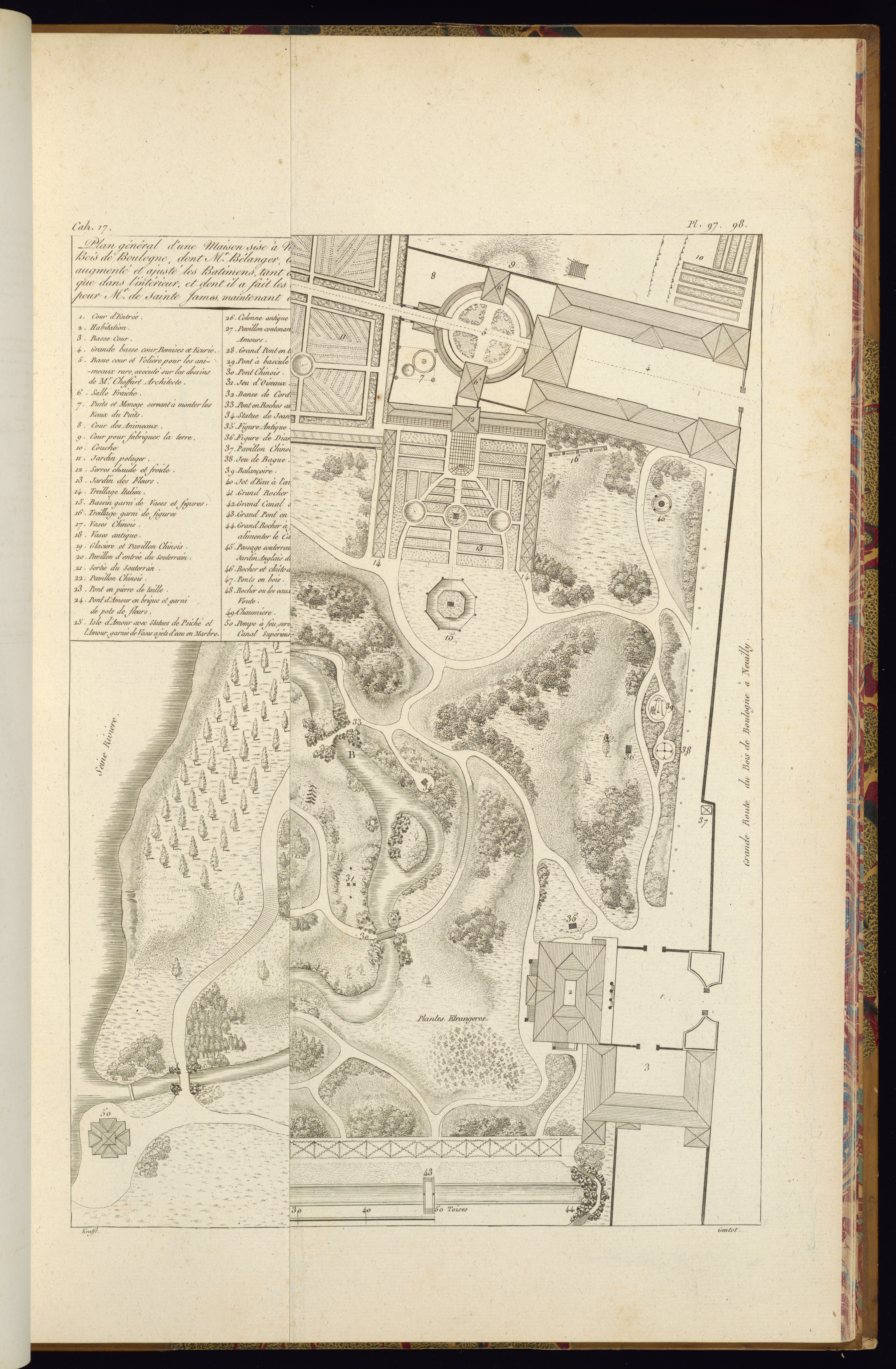 Lettered in plate, upper left corner: Cah.17; lettered upper left: Plan general d’une Maison sise à Neuilly près le/ Bois de Boulogne dont Mr. Bélanger, Architect, à/ augmenté et ajusté les Batimens tant à l’extérieur/ que dans l’intérieur et dont il a fait les Jardins anglaise/ pour Mr. de Saint James maintenant à Mr Basan./ 1 Cour d’Entrée/ 2. Habitation/ 3. Grande basse cour Remises et Ecurie/ 5. Basse cour et Voliere pour les ani-meaux rare, execute sur les dessins de Mr. Choffart Architecte/ 6. Salle Fraiche/ 7. Puits et Manege servant a monter les Eaux du Puits/ 8. Cour des Animeaux/ 9 Cour pour fabriquer la terre/ 10. Couche/ 11. Jardin potager/ 12. Serres chaude et froide/ 13. Jardin des Fleurs/ 14. Treillage Italien/ 15. Bassin garni de Vases et figures/ 16. Treillage garni de figures/ 17. Vases Chinois/ 18. Vase antique/ 19. Glaciere et Pavillon Chinois/ 20. Pavillon d;’entrée du Souterrain/ 21. Sortie du Souterrain/ 22. Pavillon Chinois/ 23. Pont en pierre de taille/ 24. Pont d’Amour en brique et garni de pots de fleurs/ 25. Isle d’Amour avec Statues de Psiche et l’Amour garni de Vases a jets d’eau en Marbre/ 26. Colonne antique/ 27. Pavillon contenant Venus trainee par les Amours/ 28. Grand Pont en bois appele pont Sphinx/ 29. Pont a bascule/ 30. Pont Chinois/ 31. Jeu d’Oiseaux/ 32. Danse de Corde/ 33. Pont en Roches avec chute d’Eau/ 34. Statue de Jean Jacques/ 25. Figure Antique/ 36. Figure de Diane/ 27. Pavillon Chinois/ 38. Jeu de Bague/ 39. Balancoire/ 40. Jet d’Eau a l;entrée du Pavillon Turc/ 41. Grand Rocher/ 42. Grand Canal superieur/ 43. Grand Pont en bois/ 44. Granc Rocher a jets d’eau pour alimenter le Canal/ 45. Passage souterrain pour communiquer au Jardin Anglais du cote de la Seine/ 46. Rocher et chute d’eau du jardin superieur/ 47. Ponts en bois/ 48. Rocher ou les eaux se perdent sous une Voute/ 49. Chaumiere/ 50. Pompe a feu servant a alimenter le Canal superieur et le grand Rocher; lettered upper right corner: Pl. 97. 98