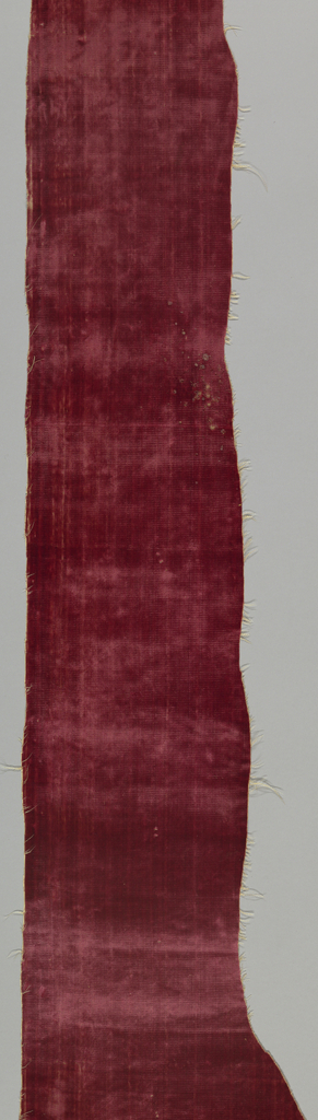 This is a Fragment. It is dated 17th century and we acquired it in 1921. Its medium is silk and its technique is cut supplementary warp pile (velvet). It is a part of the Textiles department.