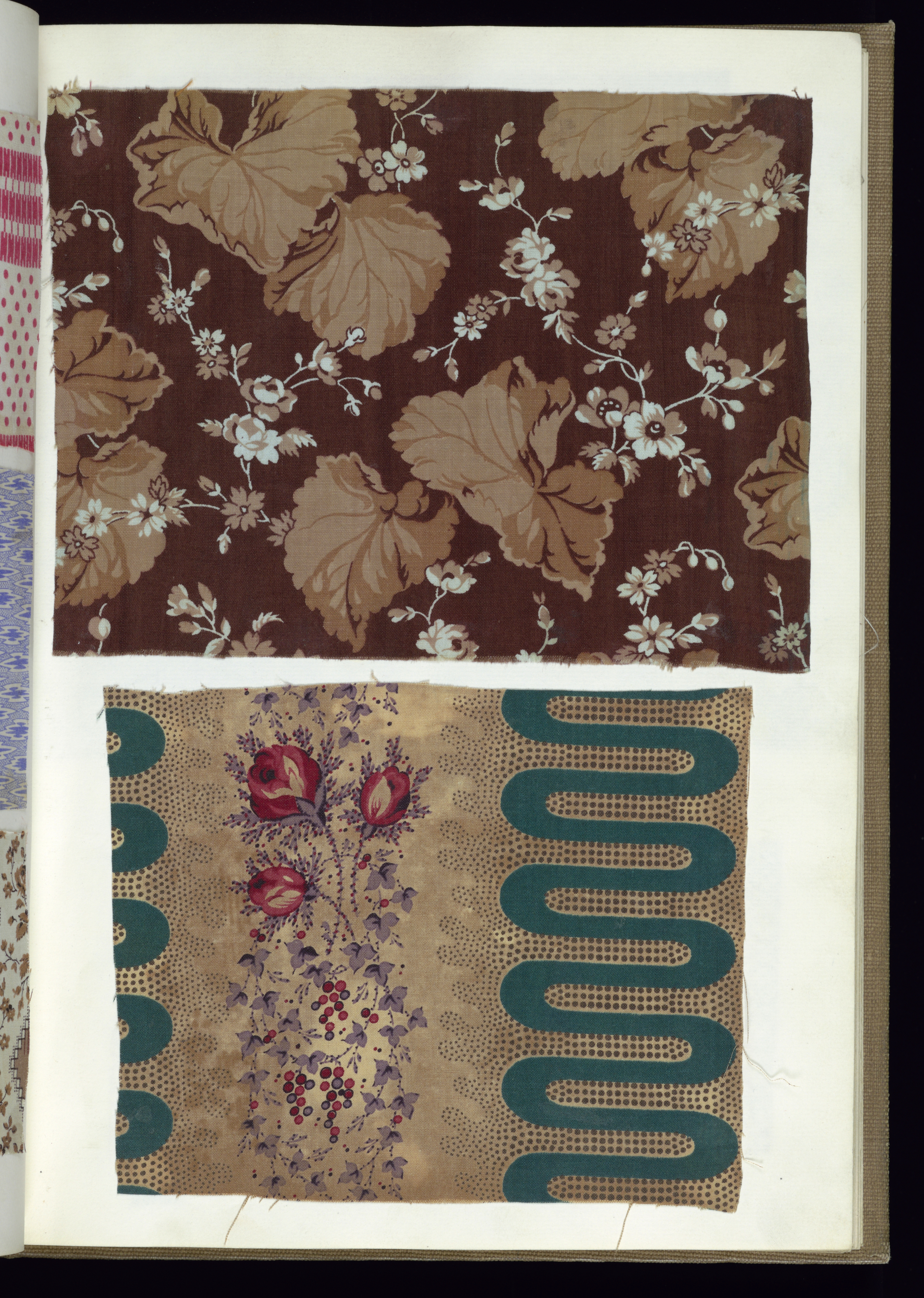 This is a Scrapbook of textile swatches. It is dated 1820–50 and we acquired it in 1921. Its medium is cardboard, leather, paper, cotton and its technique is printed. It is a part of the Textiles department.