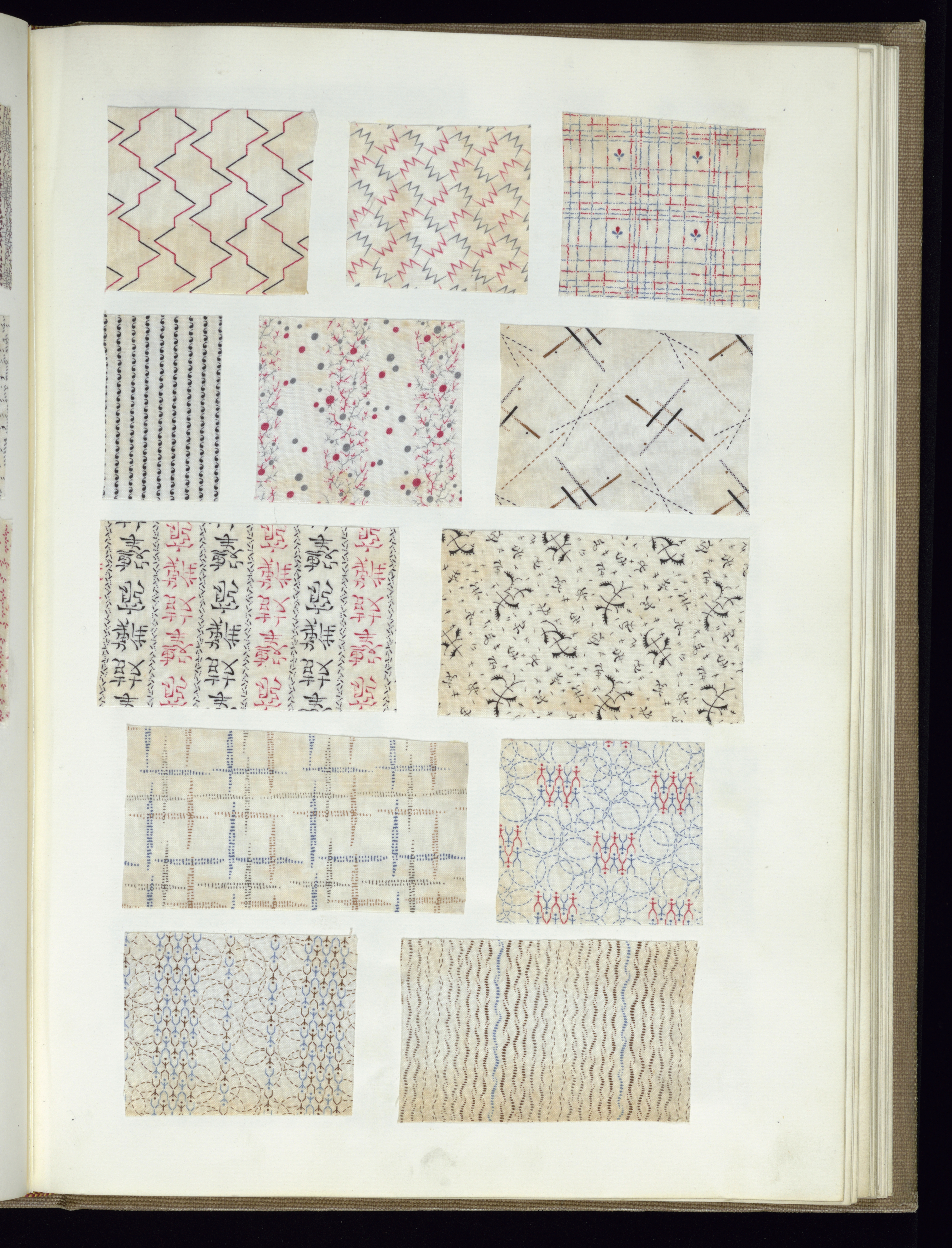 This is a Scrapbook of textile swatches. It is dated 1820–50 and we acquired it in 1921. Its medium is cardboard, leather, paper, cotton and its technique is printed. It is a part of the Textiles department.