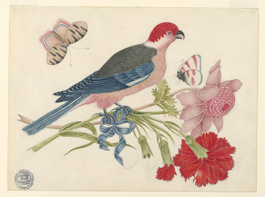 Drawing, Pink, Red, Blue, and Black Bird on Branch with Blossoms and Butterflies; pen and ink, graphite on coated wove paper; 19.5 × 26.5 cm (7 11/16 × 10 7/16 in.); Gift of Eleanor and Sarah Hewitt; 1923-22-19