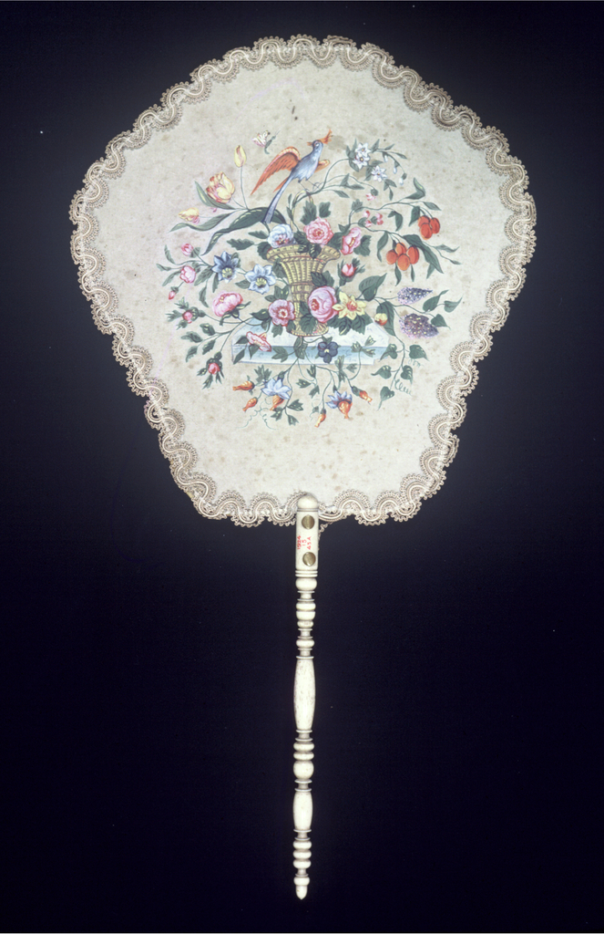 This is a Handscreen. It is dated late 18th century and we acquired it in 1924. Its medium is hand-painted silk leaf with passementerie, turned ivory handle. It is a part of the Textiles department.
