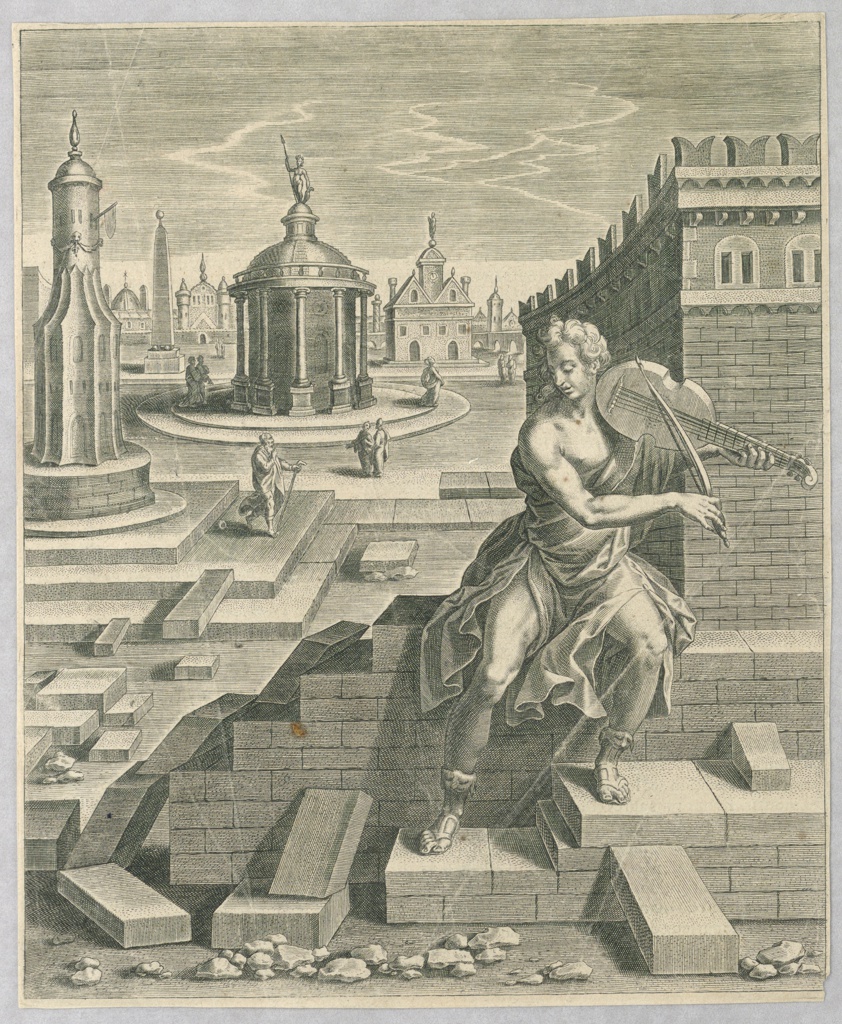 Print, Amphion, from Les images ou tableaus de platte peinture de Philostrate Lemnien Sophiste Grec (The Images or Flat Paintings of Greek Sophist Philostratus of Lemnos); Designed by Antoine Caron (French, 1521 – 1599); engaving on paper; Gift of Eleanor and Sarah Hewitt; 1924-41-69