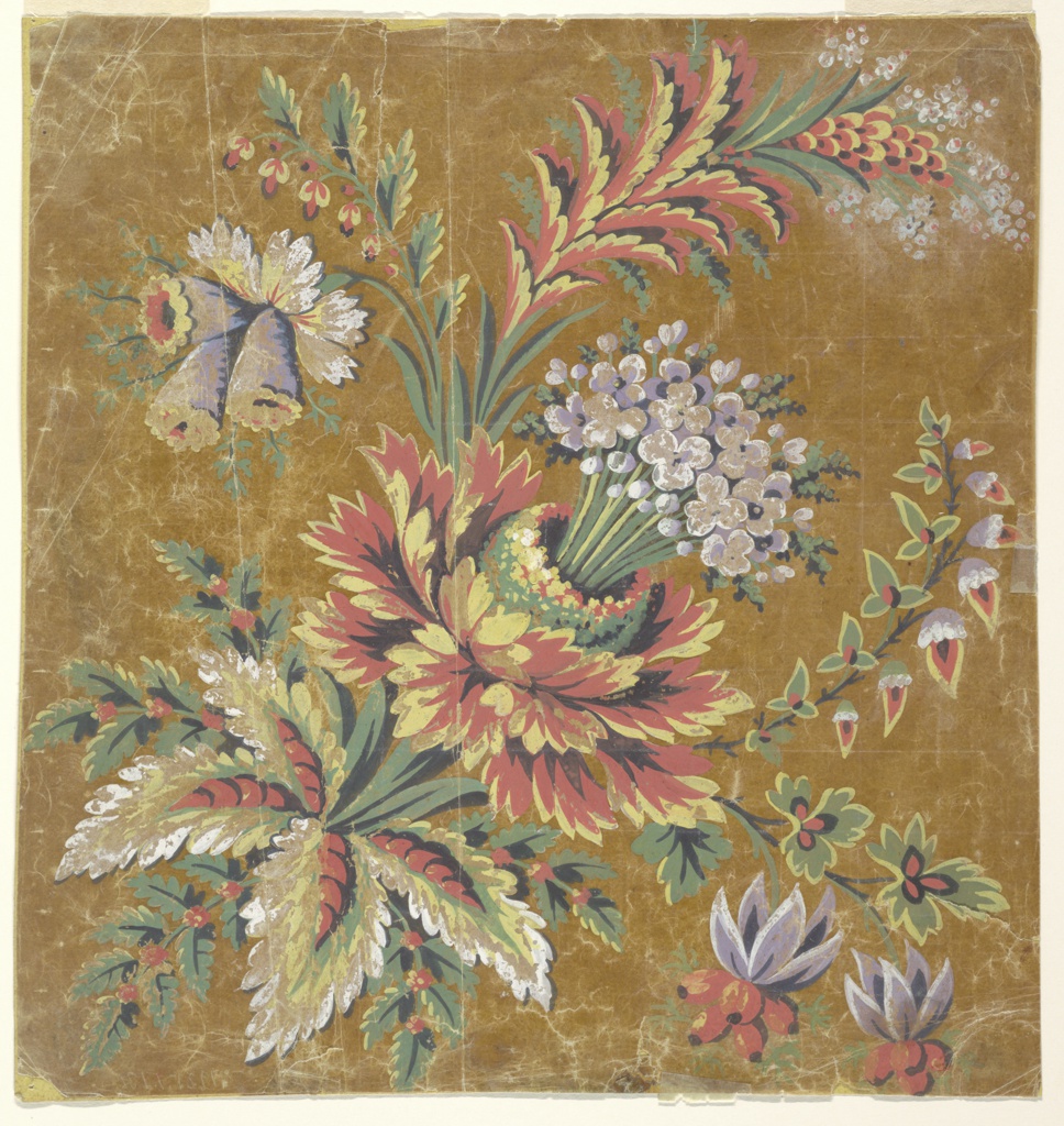 The exuberant and explosive power of this large-scale floral design perfectly illustrates how designers approached flowers, making them active rather than passive forms of ornamentation. Skilled embroiderers retained the same essence of vitality in their needlework for waistcoats.