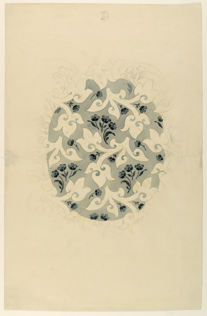 Drawing, Project for a woven or printed fabric; Manufactured by P. and C. Lacour; France; blotted black and black crayon, brush and watercolor on paper; 50.3 x 32.6 cm (19 13/16 x 12 13/16 in.); Purchased for the Museum by the Advisory Council; 1925-1-231