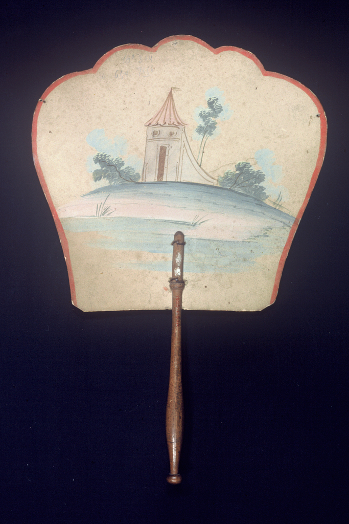This is a Handscreen. It is dated 18th century and we acquired it in 1925. Its medium is painted paper leaf, turned wood handle. It is a part of the Textiles department.