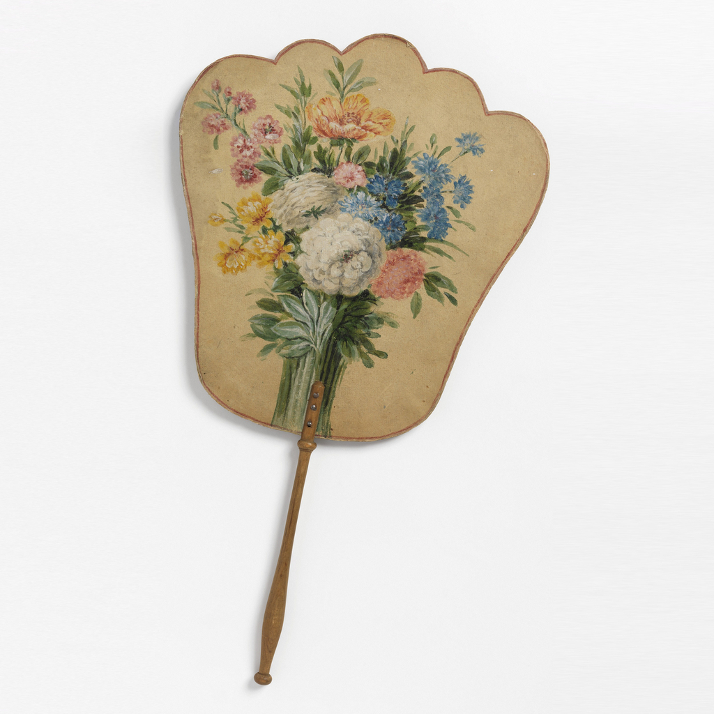This is a Handscreen. It is dated mid- 18th century and we acquired it in 1925. Its medium is painted paper leaf, turned wood handle. It is a part of the Textiles department.