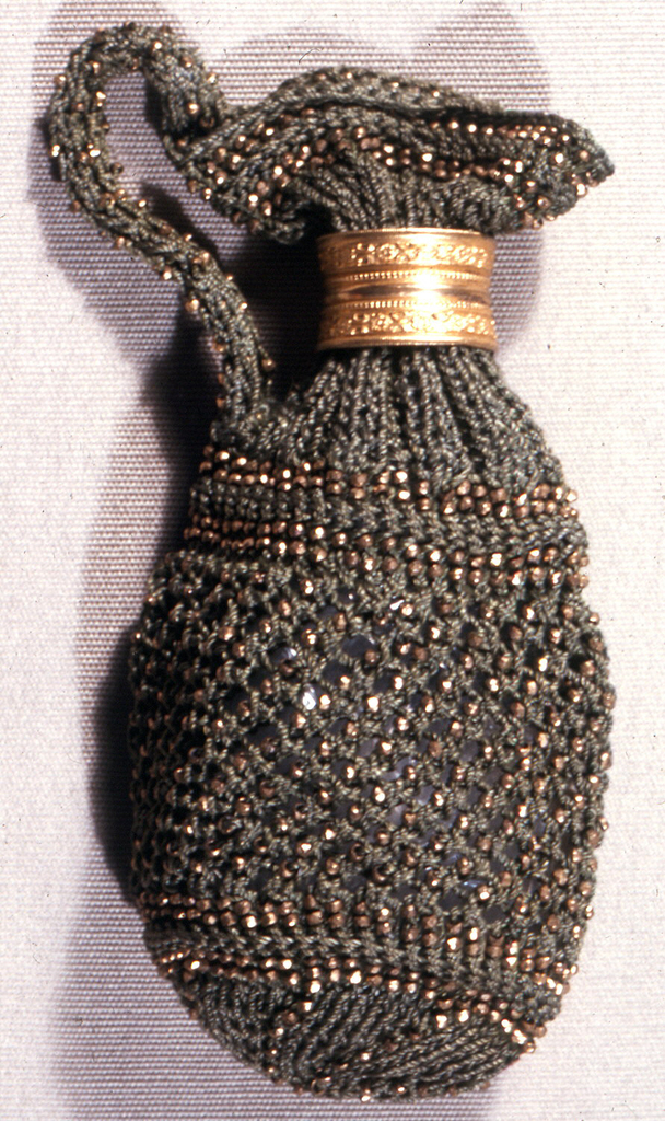 This is a Purse (pence jug). It is dated 1830–60 and we acquired it in 1925. Its medium is silk, metal beads and its technique is knitted. It is a part of the Textiles department.