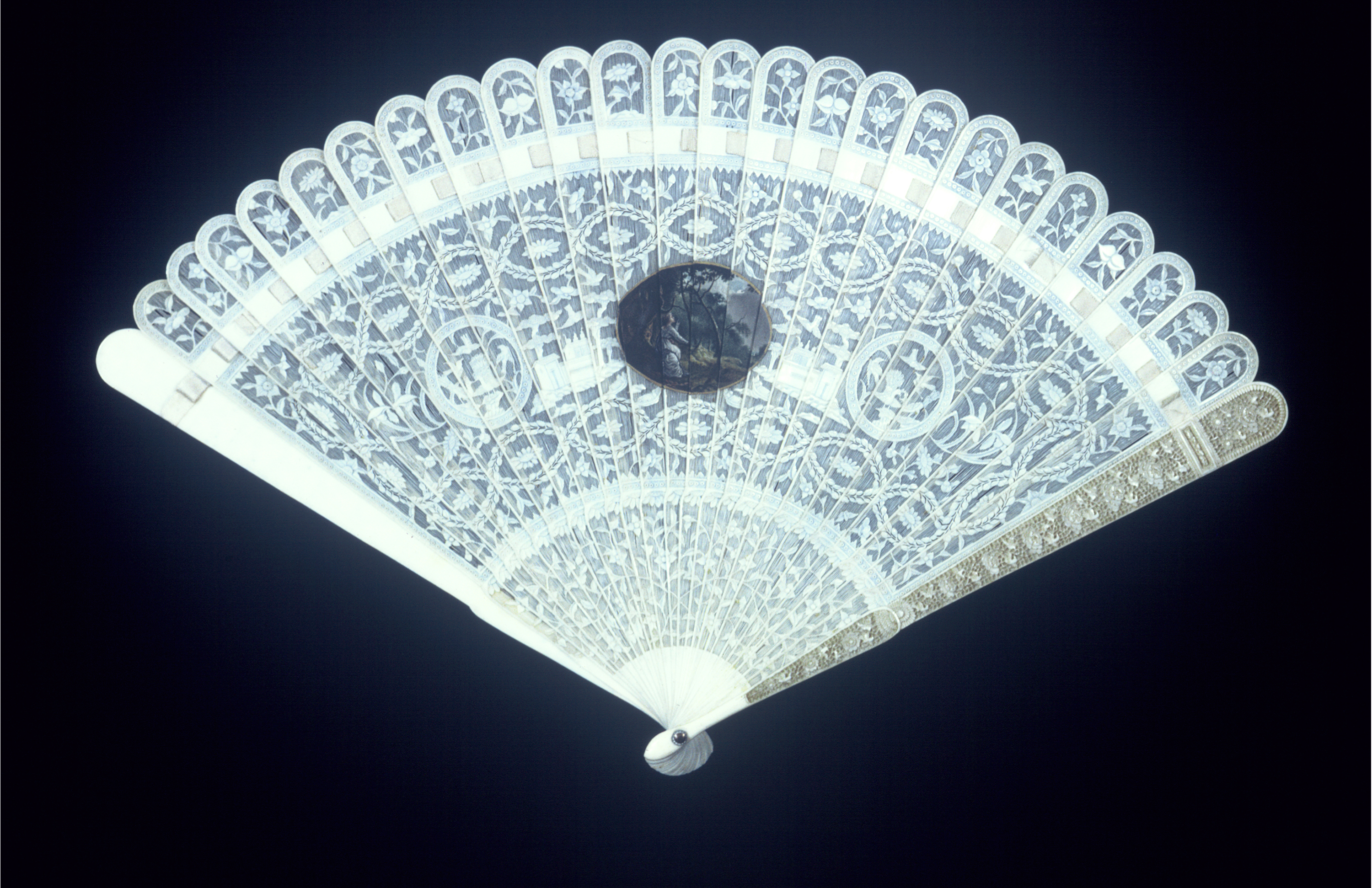 This is a Brisé fan. It is dated 1780–1800 and we acquired it in 1926. Its medium is carved, pierced and painted ivory sticks, silk ribbon. It is a part of the Textiles department.