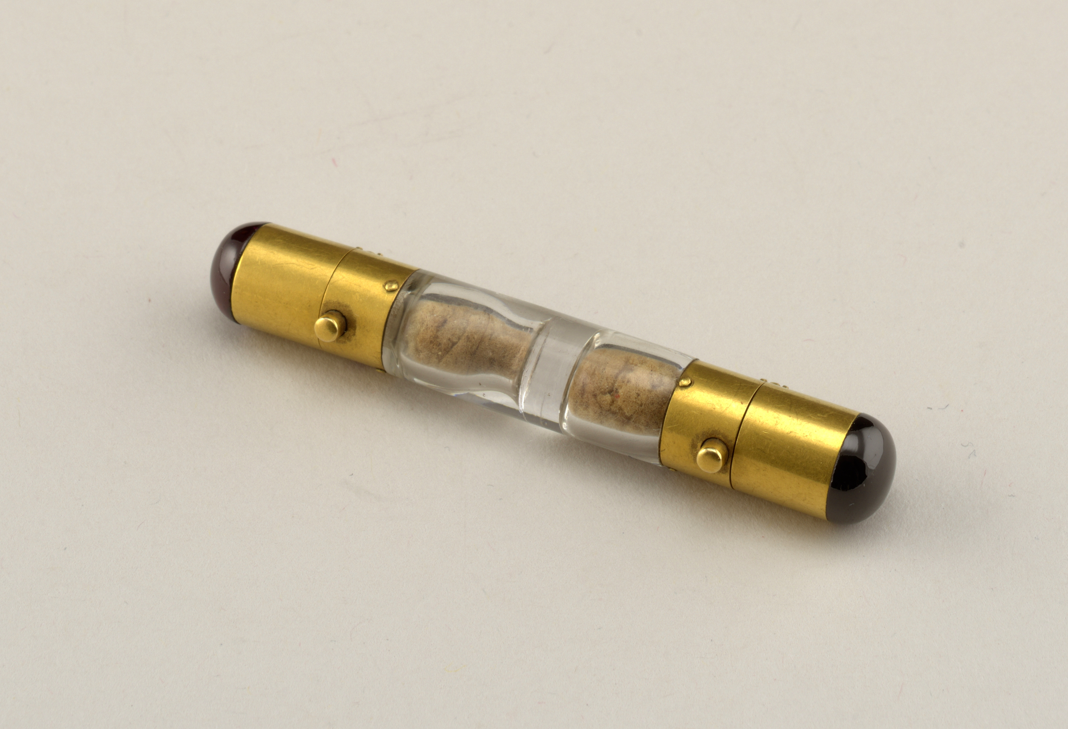 This is a Scent flask. It is dated 19th century and we acquired it in 1926. Its medium is glass, gold mounts. It is a part of the Product Design and Decorative Arts department.