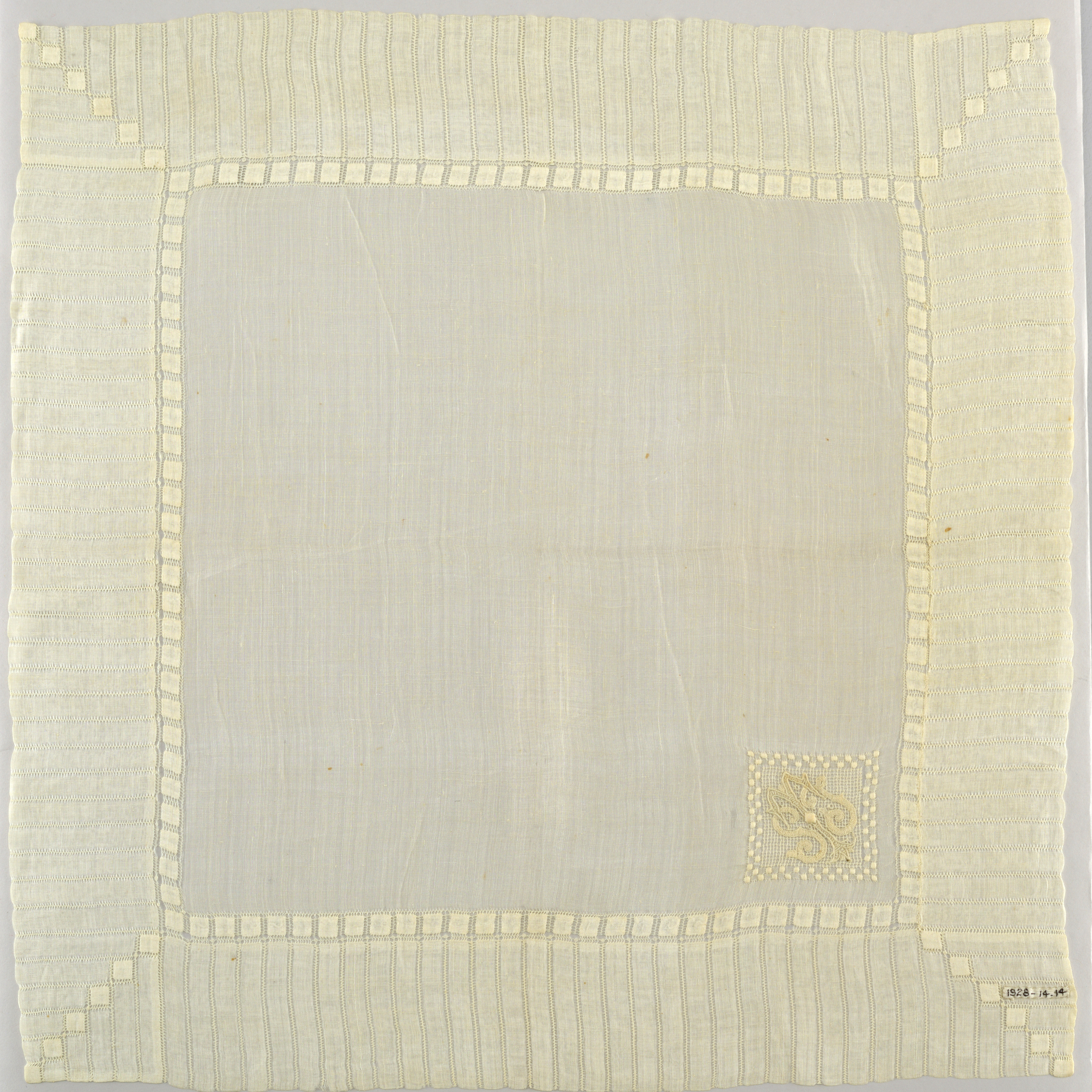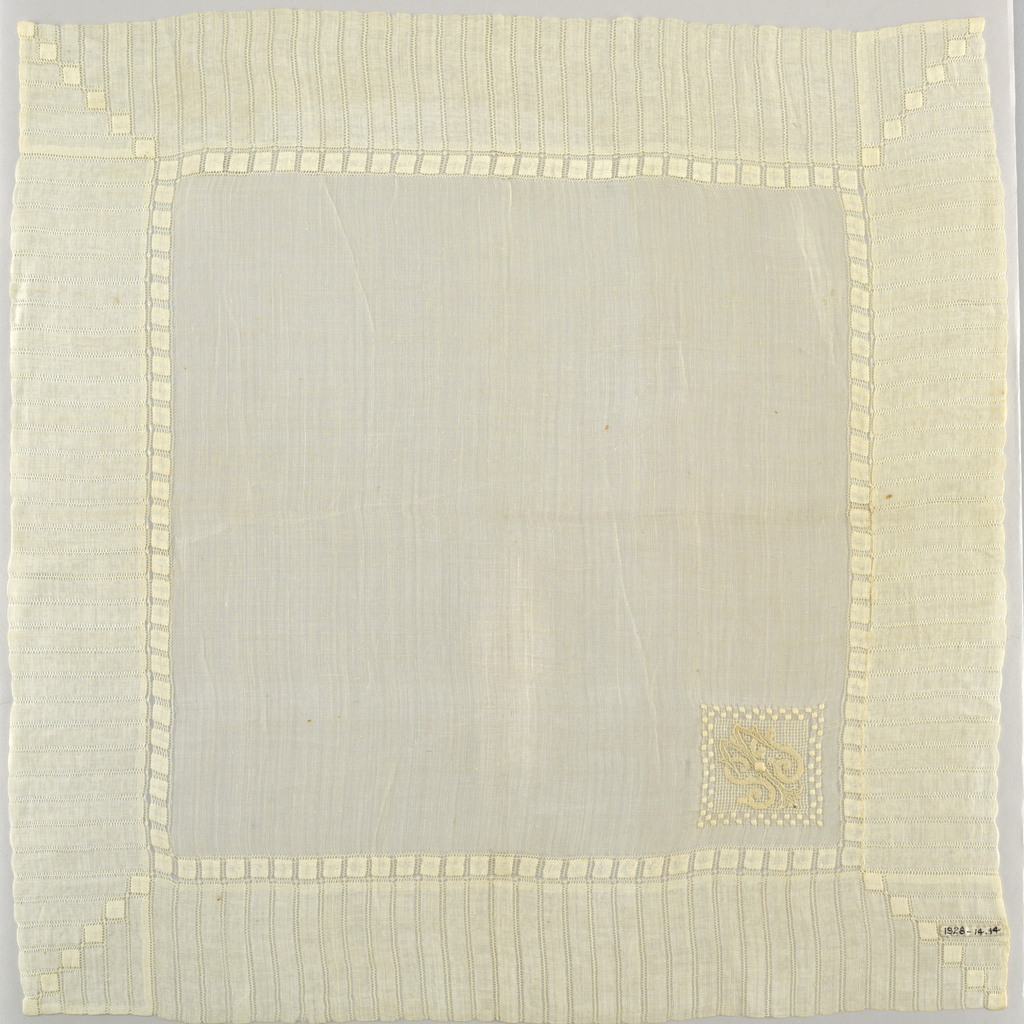 This is a Handkerchief. It is dated 19th century and we acquired it in 1928. Its medium is linen and its technique is embroidered. It is a part of the Textiles department.