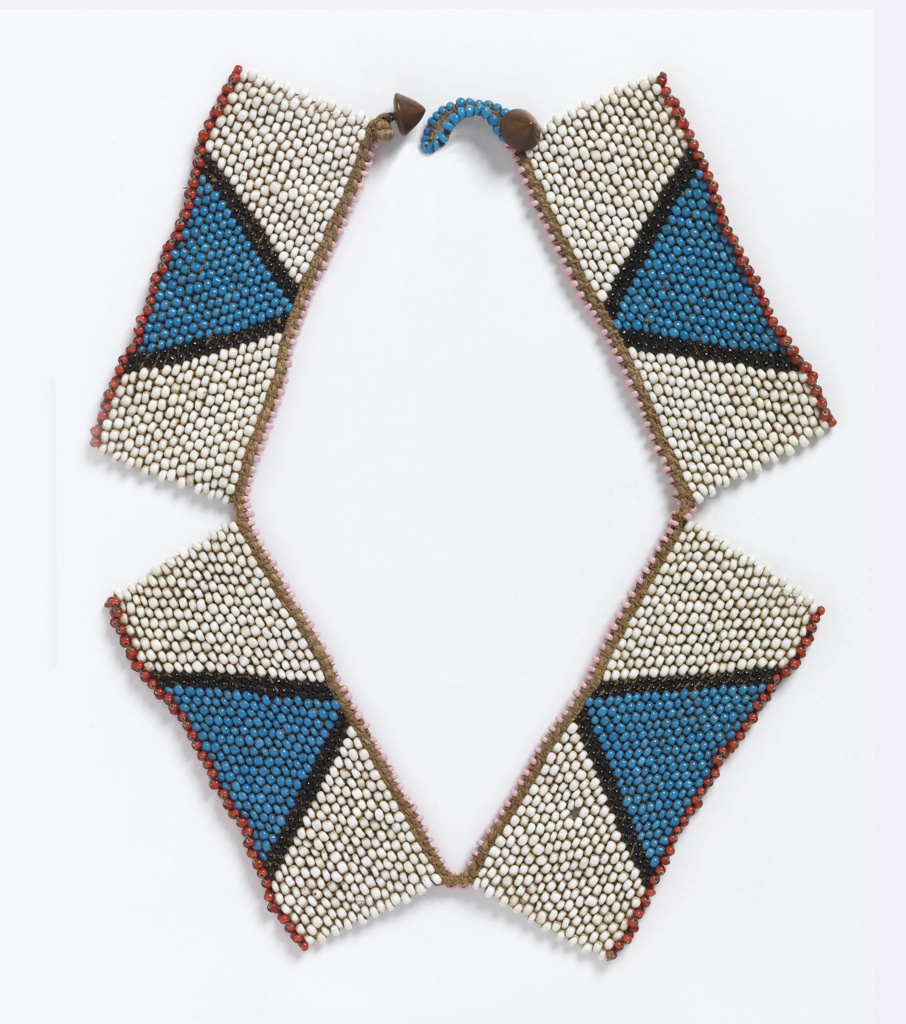 Patterned beadwork was traditionally worn by Zulu and Xhosa women and men to indicate status and rites of passage. Necklaces such as this could also be used for communication between courting couples.