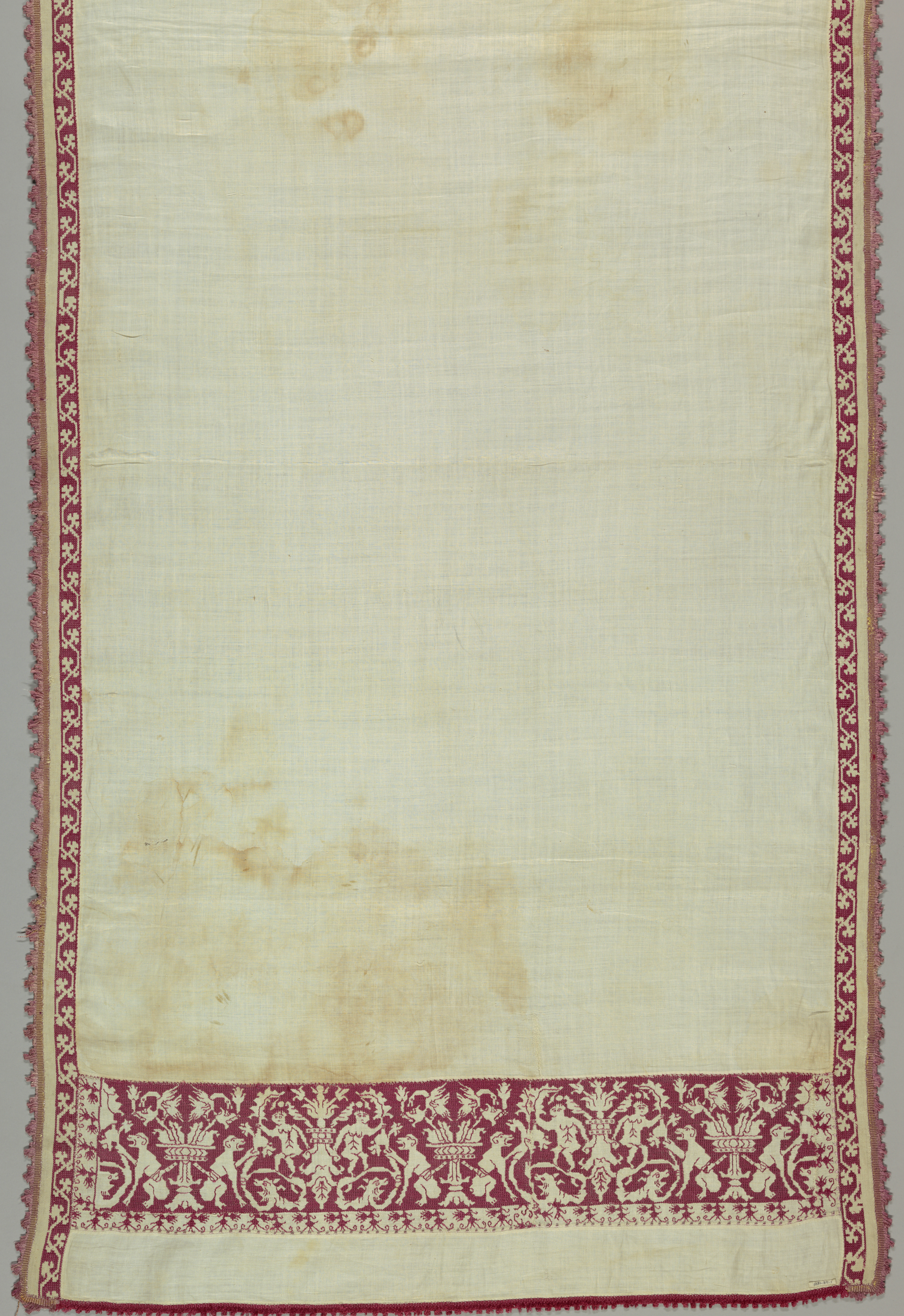 This is a Towel. It is dated 16th century and we acquired it in 1931. Its medium is silk embroidery, linen foundation and its technique is embroidered on plain weave. It is a part of the Textiles department.