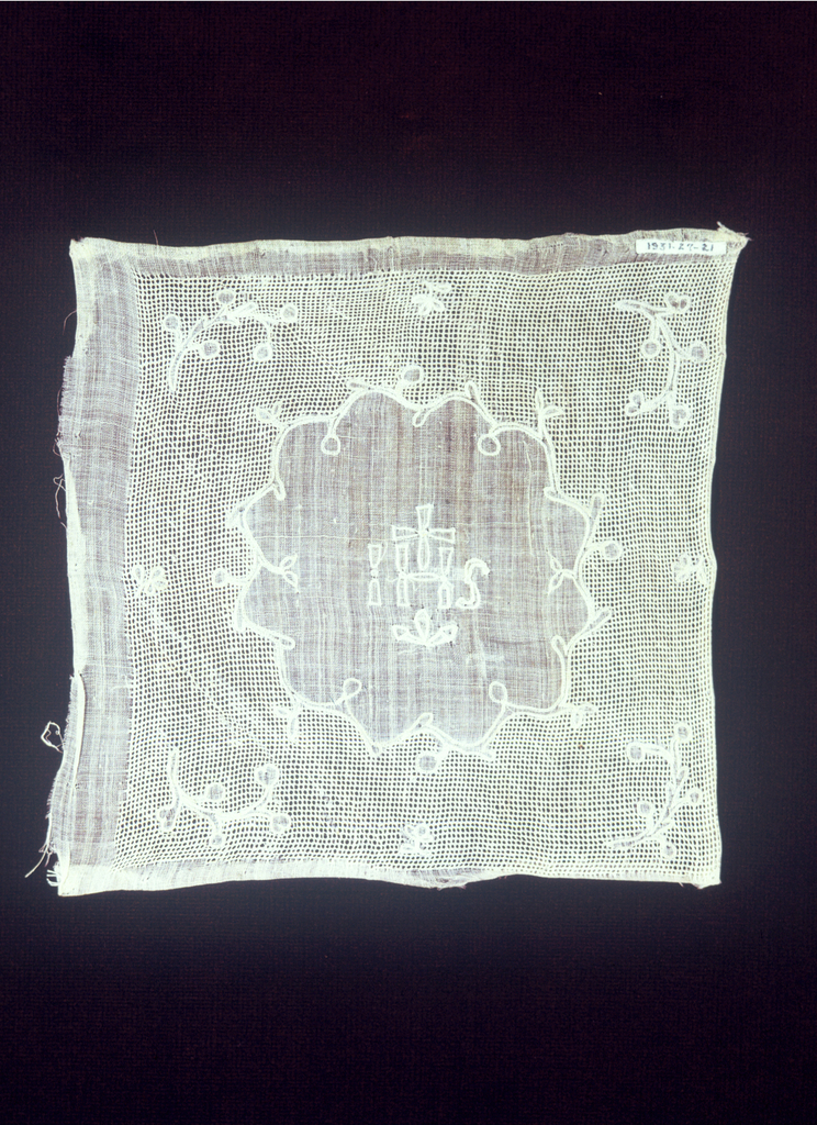 This is a Chalice cover. It is dated 18th century and we acquired it in 1931. Its medium is linen. It is a part of the Textiles department.