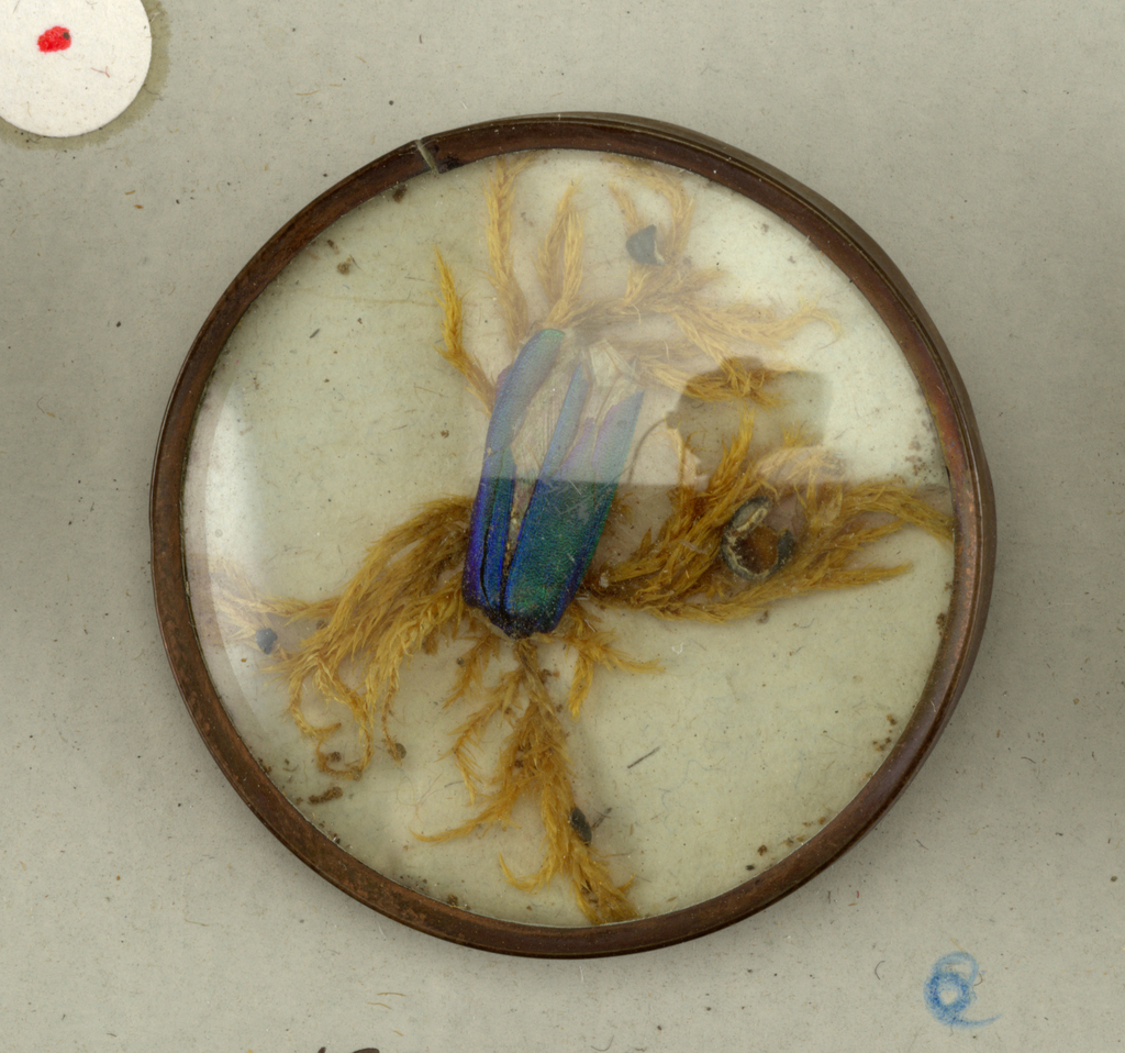 This is a buttons. It is dated late 18th century and we acquired it in 1931. Its medium is insects, shell, seaweed, paper, copper, tin, glass. It is a part of the Product Design and Decorative Arts department.